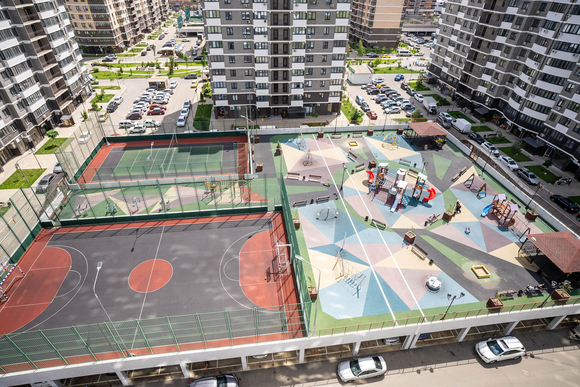 • На территории спортивная площадка с тренажёрами, игровая детская площадка,