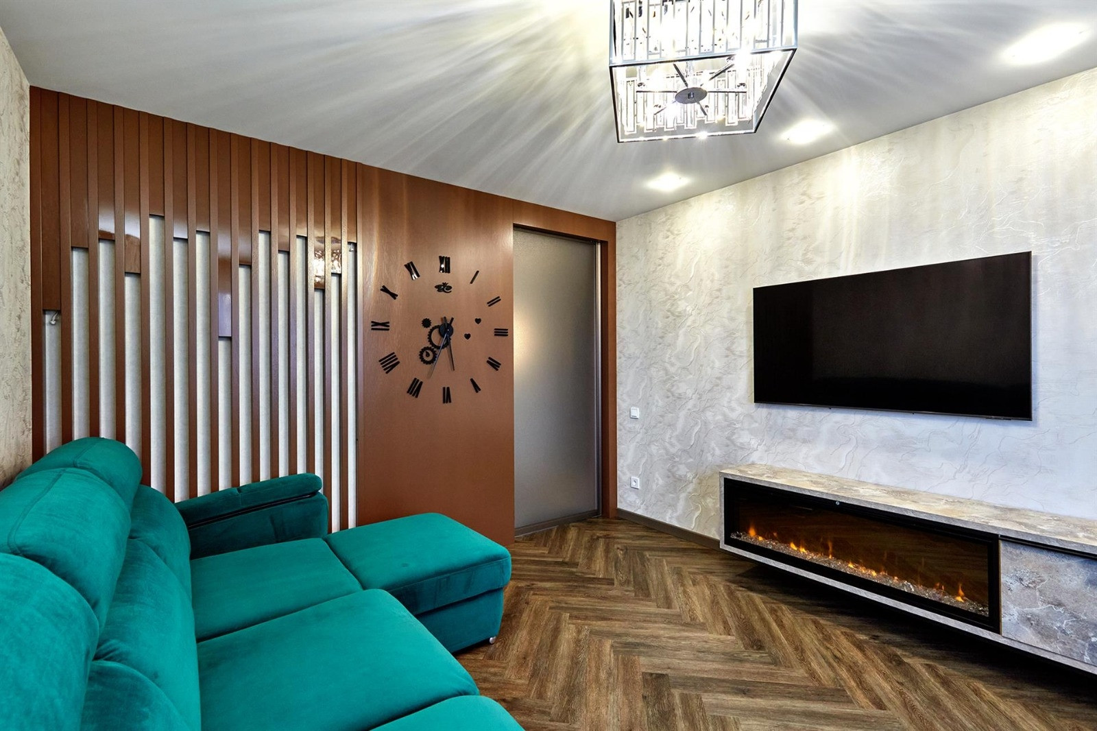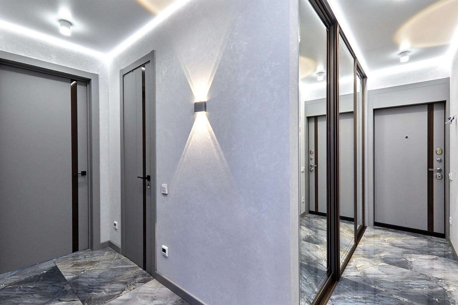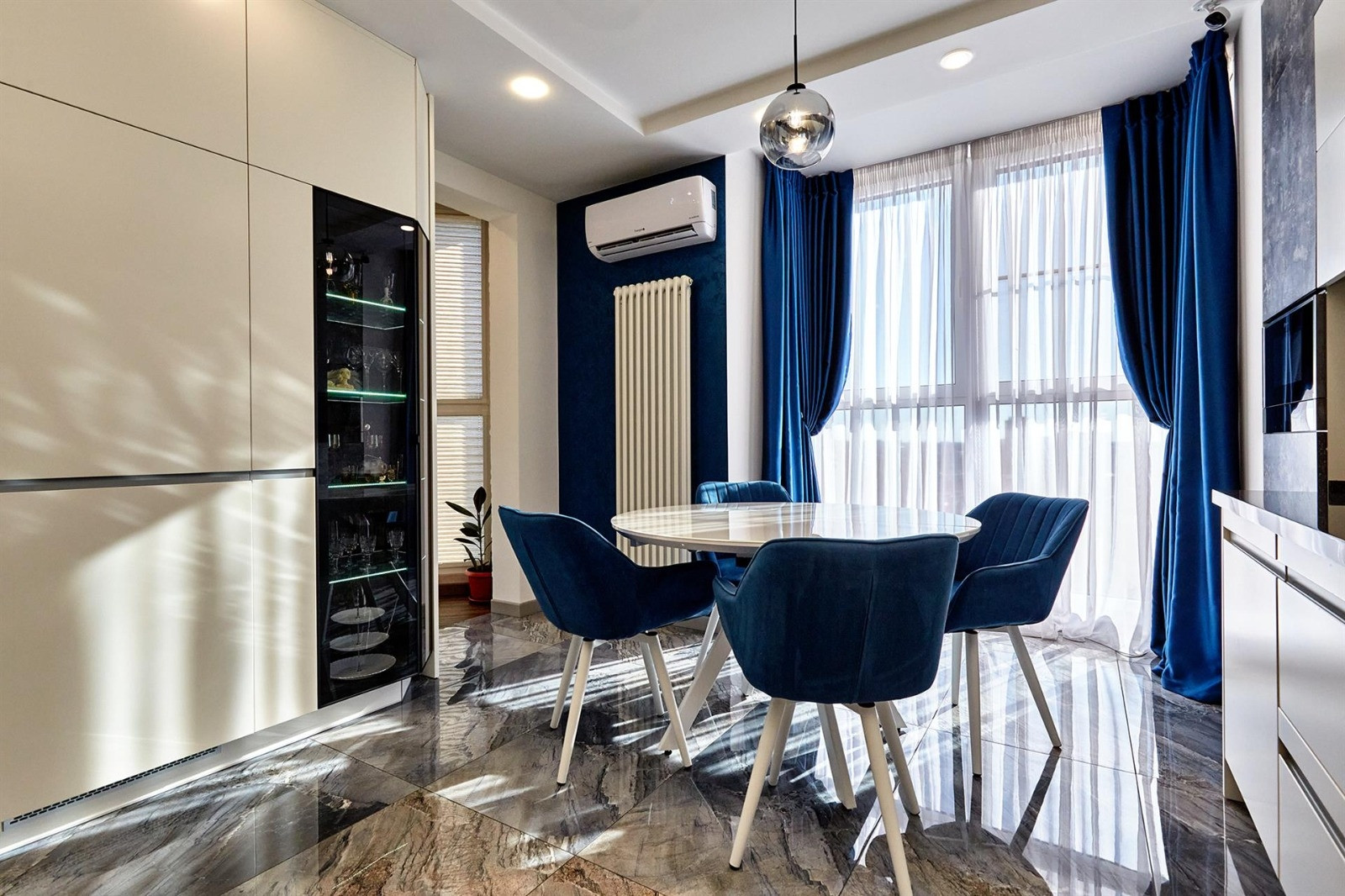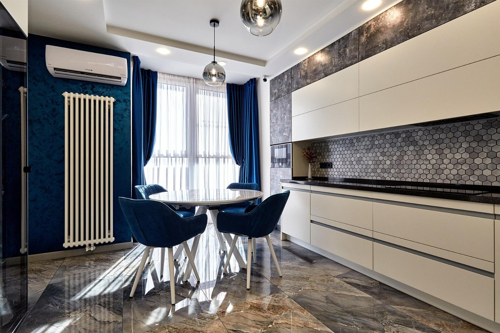Квартира включает в себя две изолированные комнаты и кухню-гостиную, два санузла (одно с ванной, другое с душевой кабиной) и много места для хранения вещей. Отделка выполнена из дорогих строительных материалов, таких как декоративная штукатурка стен ручной работы, гипсокартонные потолки, теплые полы, светодиодная подсветка, шторы с электроприводом, плитка керамогранит и вертикальные дизайнерские радиаторы. Бытовая техника представлена элитным немецким брендом Neff.