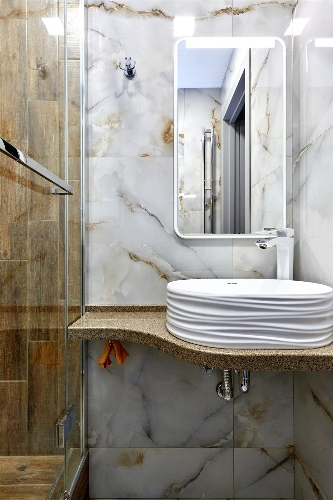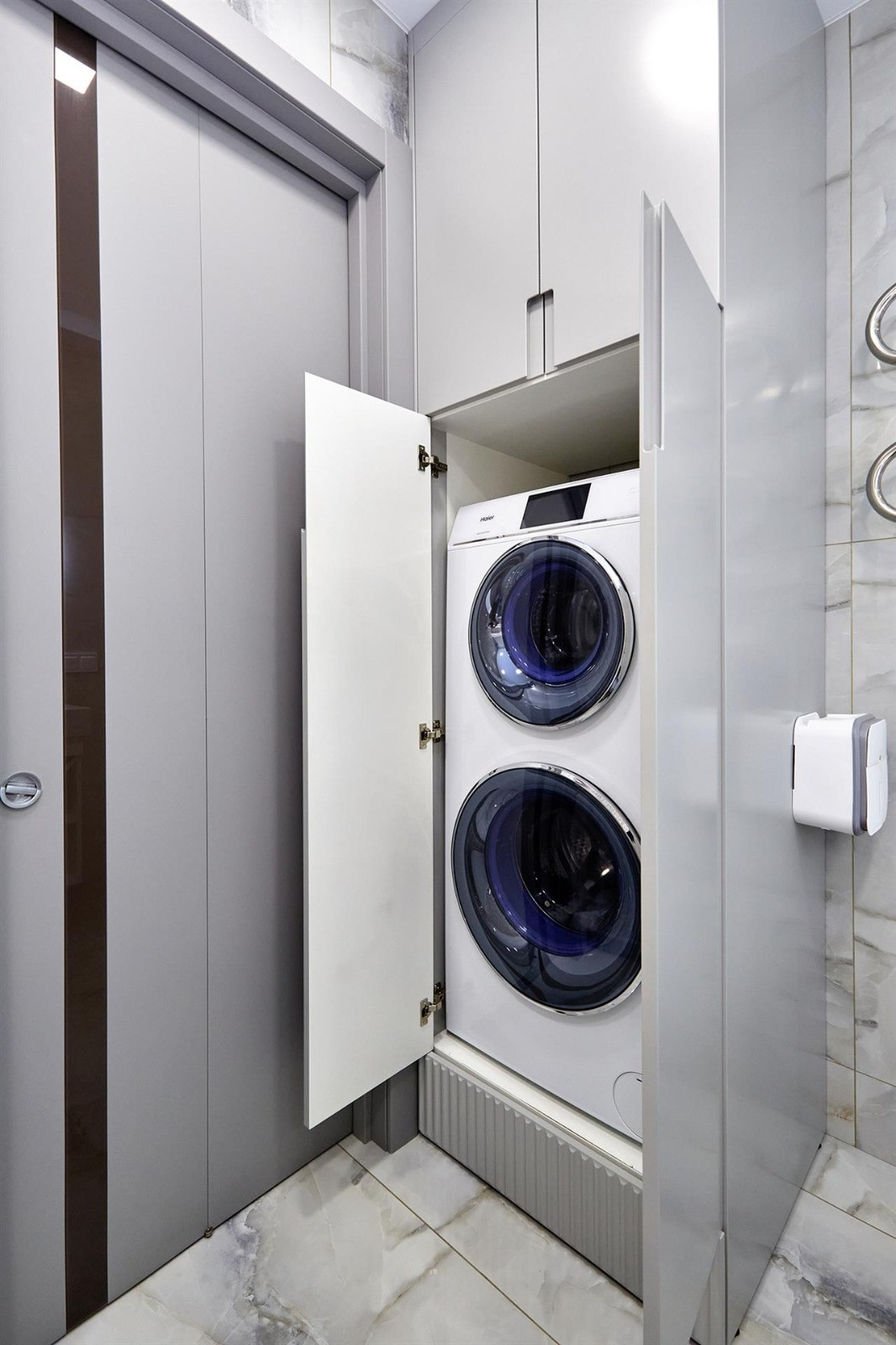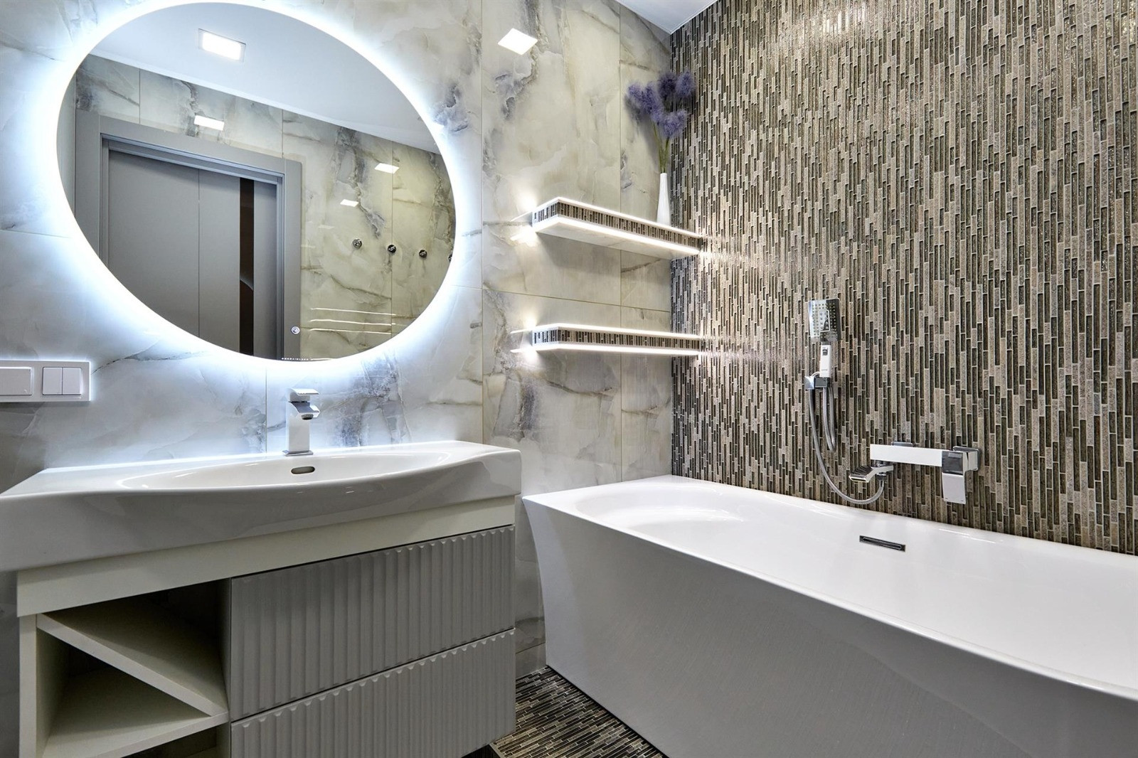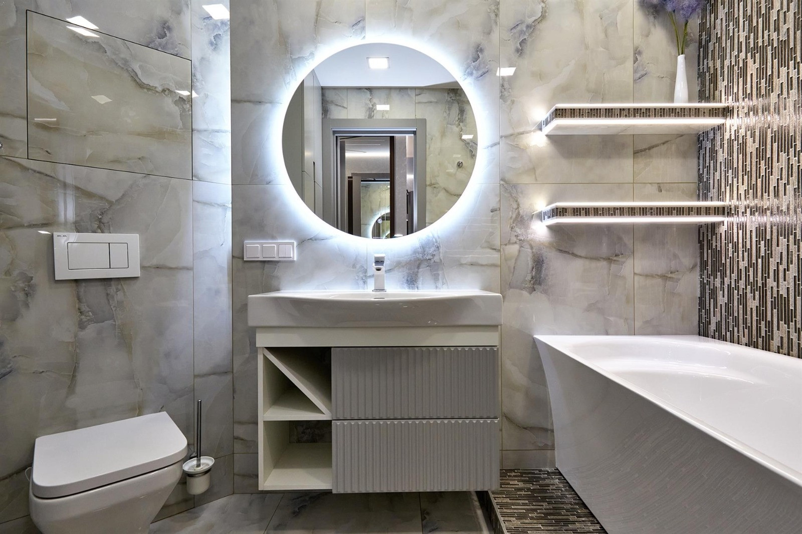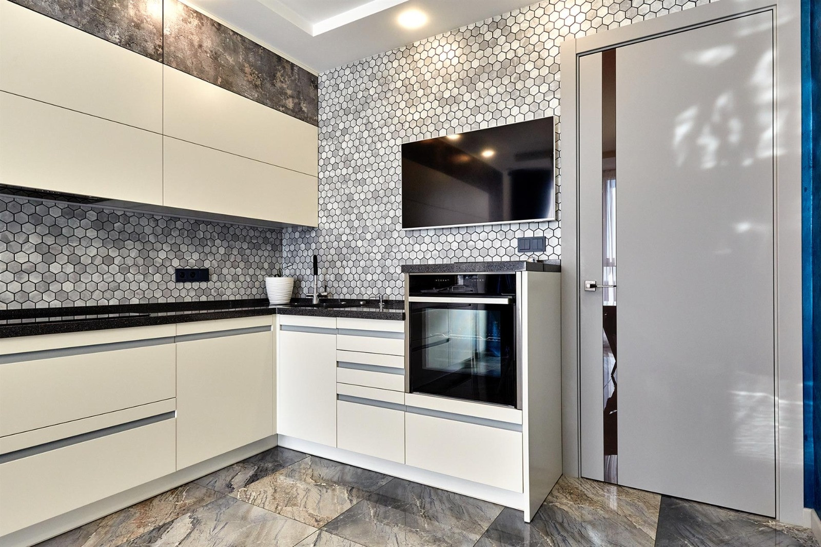 Квартира включает в себя две изолированные комнаты и кухню-гостиную, два санузла (одно с ванной, другое с душевой кабиной) и много места для хранения вещей. Отделка выполнена из дорогих строительных материалов, таких как декоративная штукатурка стен ручной работы, гипсокартонные потолки, теплые полы, светодиодная подсветка, шторы с электроприводом, плитка керамогранит и вертикальные дизайнерские радиаторы. Бытовая техника представлена элитным немецким брендом Neff.