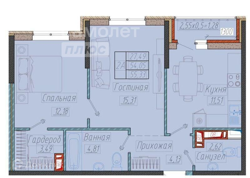 Общая площадь 54.4 м2