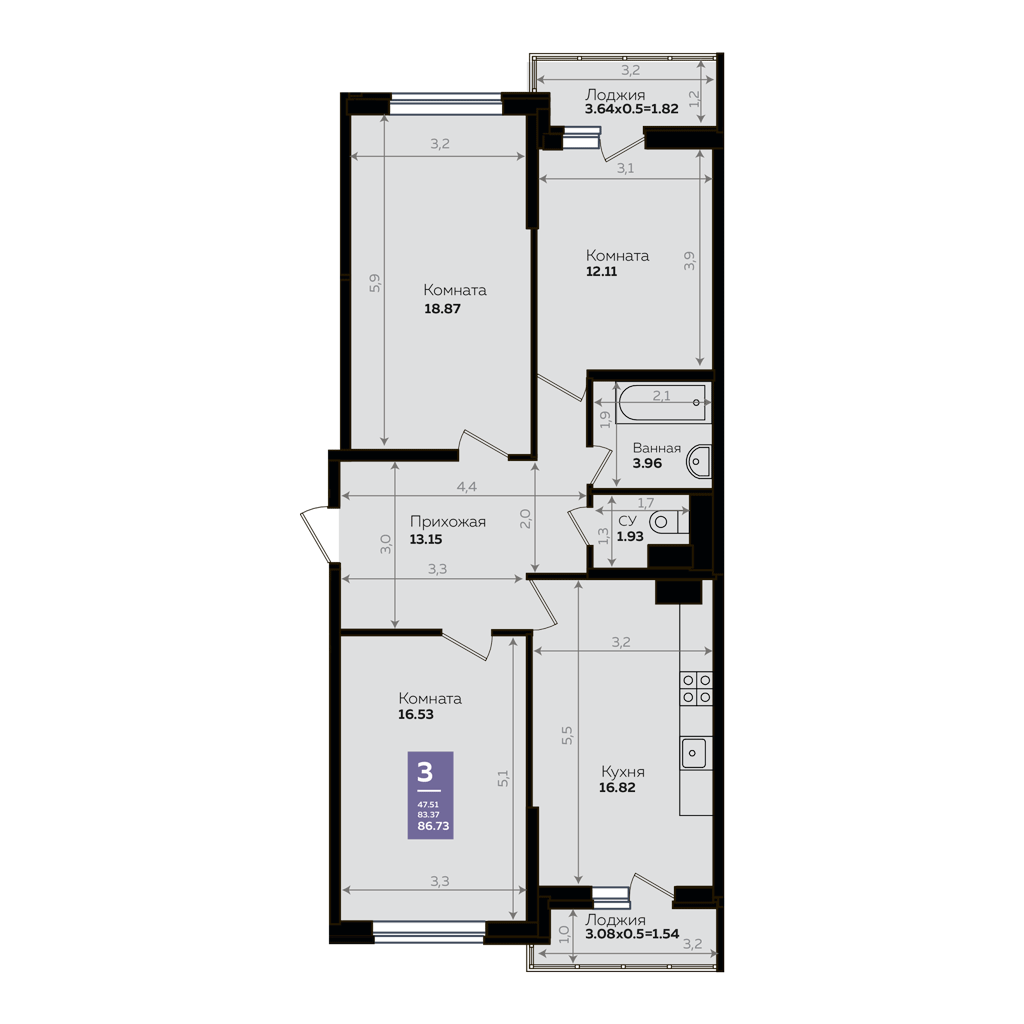 Общая площадь 83.3 м2