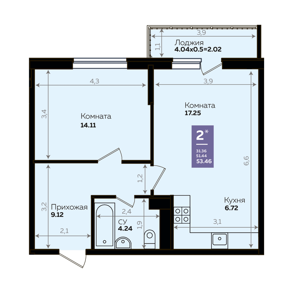 Общая площадь 51.5 м2
