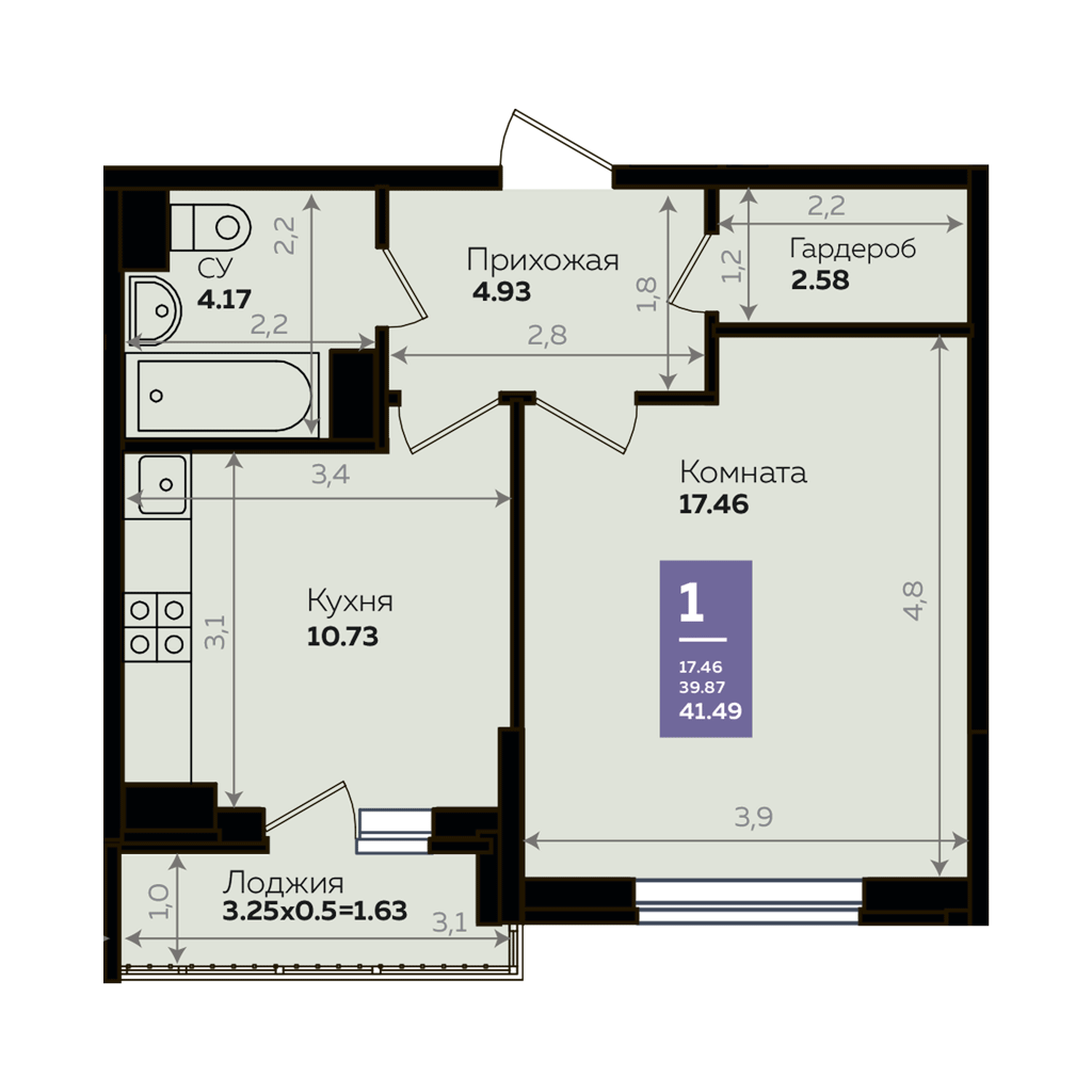 Общая площадь 40.1 м2