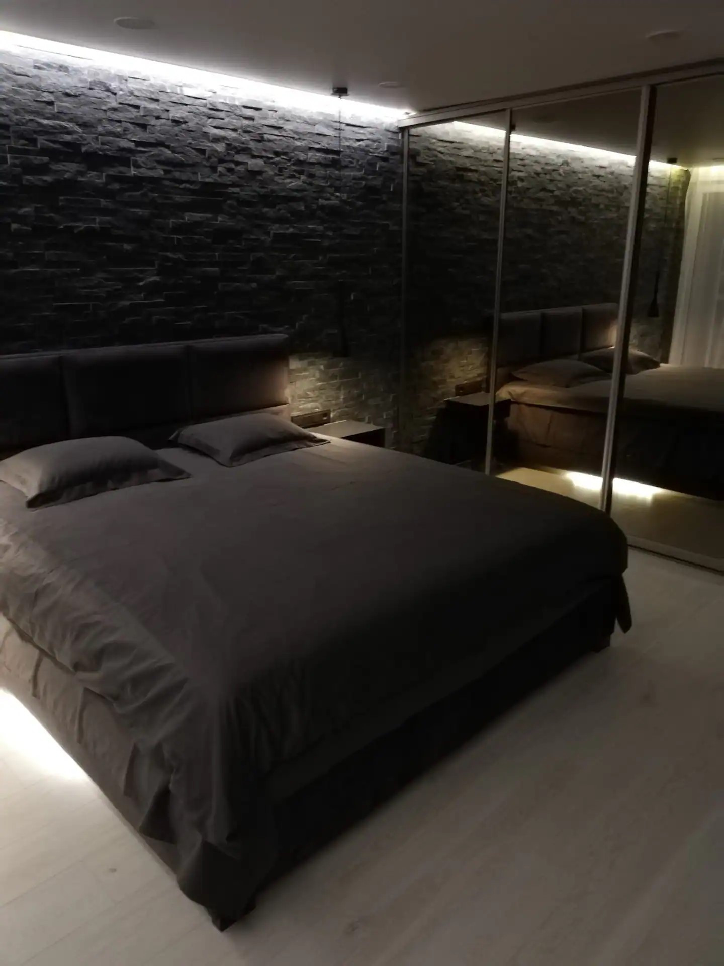 Спальня сделана в черных тонах с шикарной подсветкой. так же в спальне большой встроенный шкаф-купе с зеркалами.