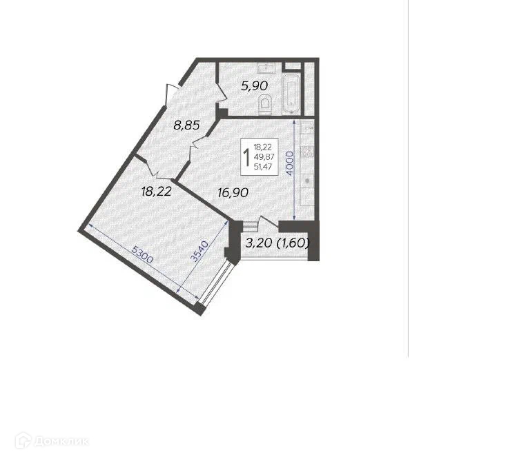 Общая площадь 51.47 м2