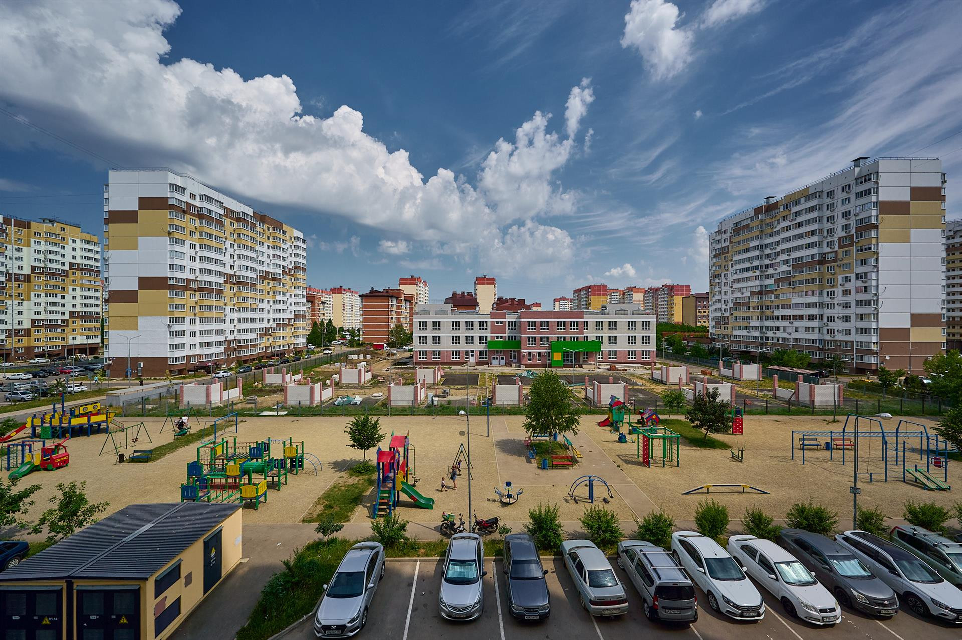 Вся нужная инфраструктура рядом: из окон видно школу, так что путь своего ребёнка можно отслеживать прямо из квартиры. Детский сад строится прямо напротив дома! Две детские площадки. Сзади здания парковка. Рядом около пяти магазинов и супермаркетов.