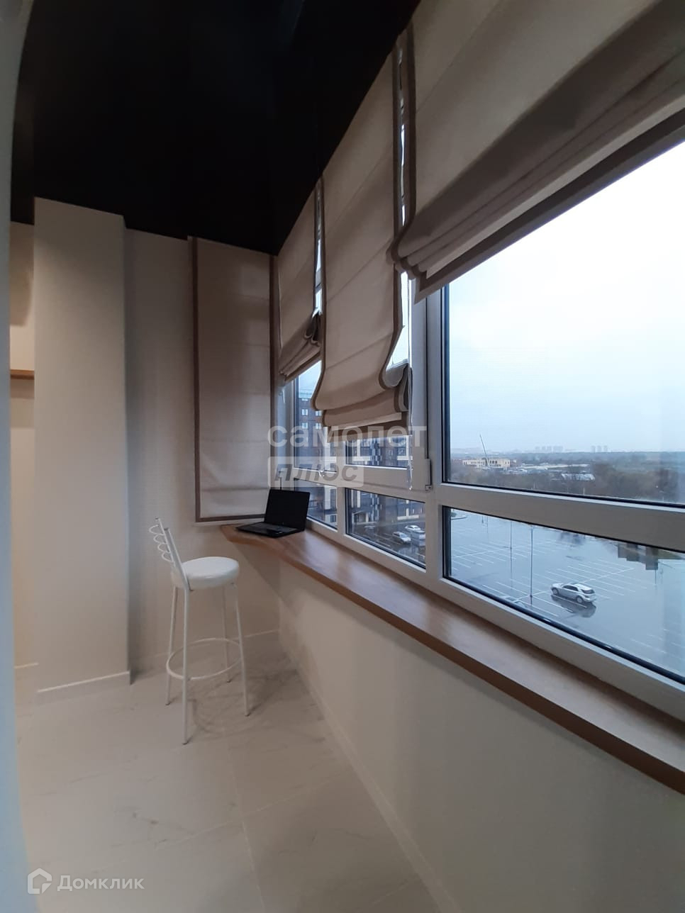 На объединённом с кухней балконе обустроена рабочая зона с видом на город.