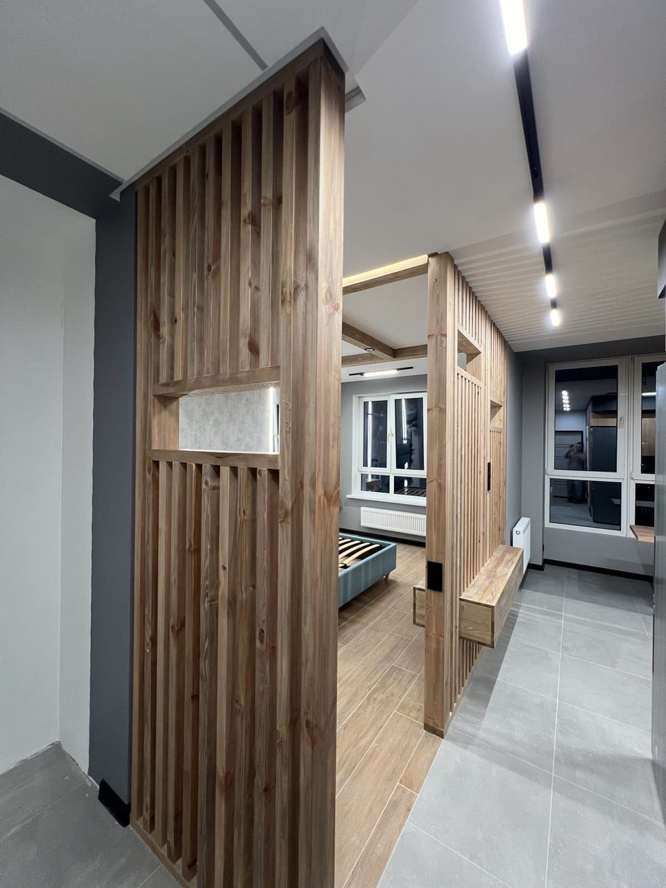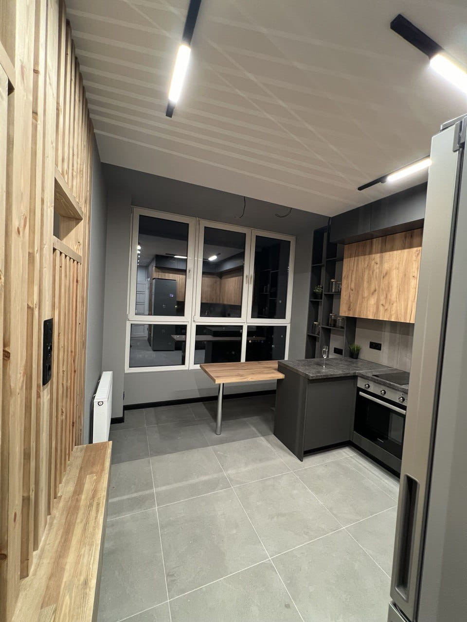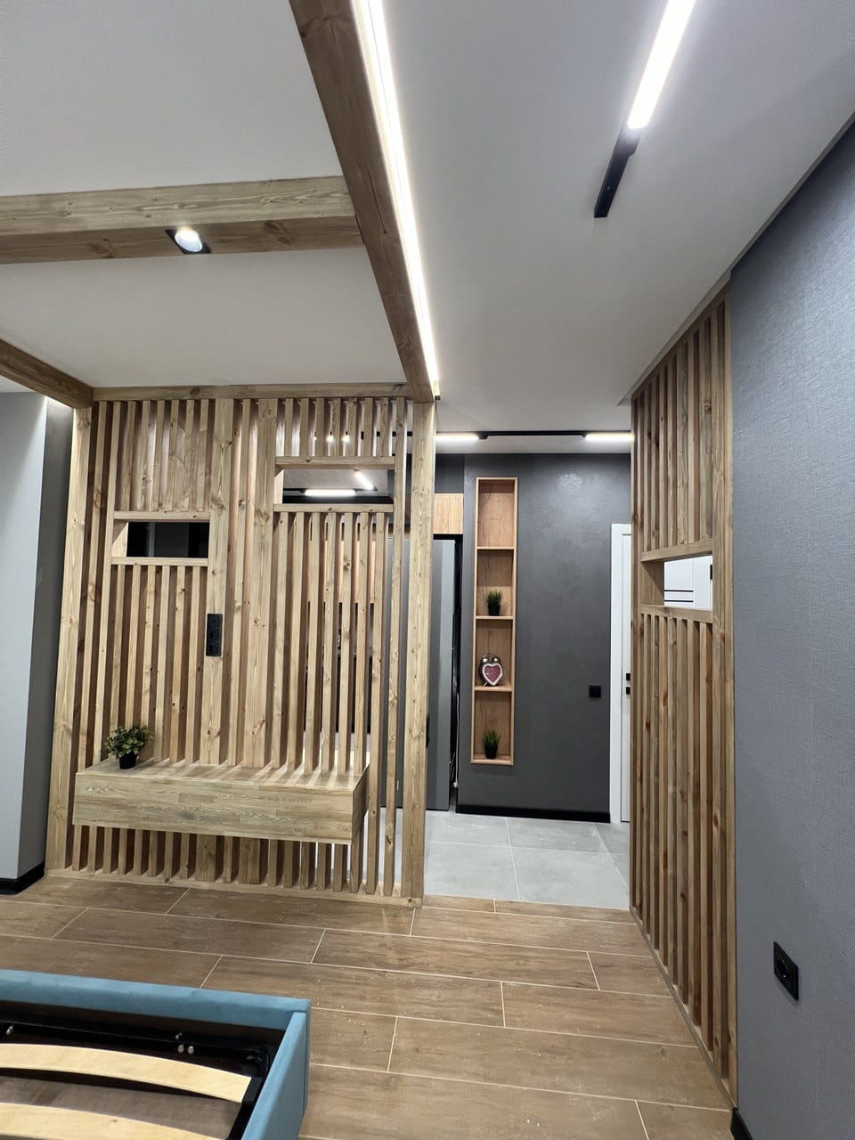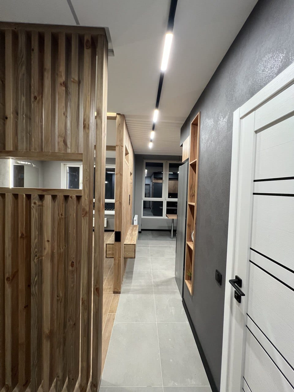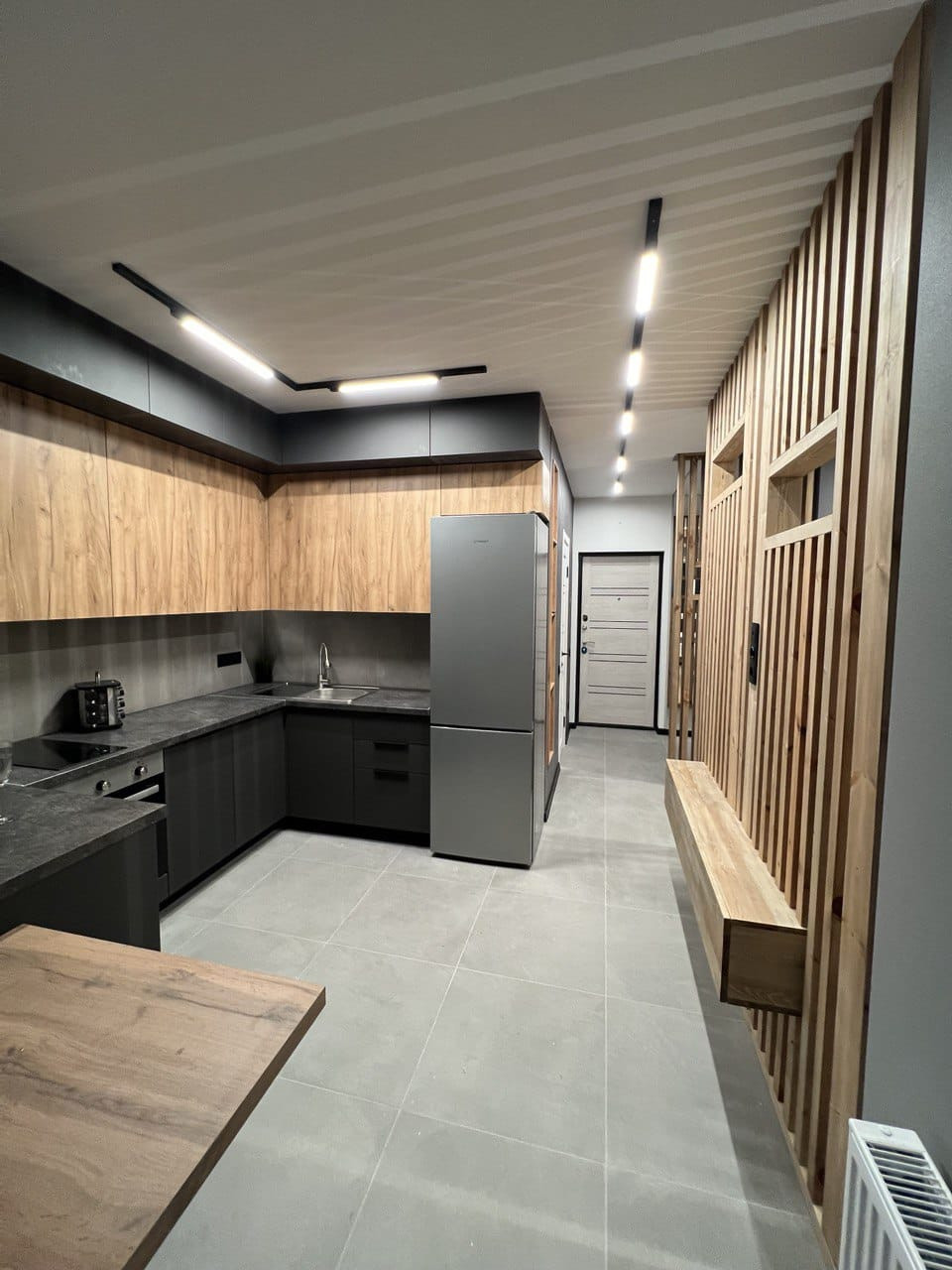В квартире ремонт, который выполнен по дизайн- проекту. Квартира практически полностью укомплектована- кухонный гарнитур, холодильник, кровать, телевизор, посудомоечная машина, духовой шкаф и варочная панель, бойлер. Много различного освещения и подсветок, различные полки для хранения, декоративные рейки, встроенный стол на кухне. На полу плитка, в санузле также всё в плитке, инсталляция, тропический душ, вывод под стиральную машину.