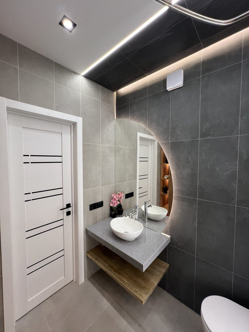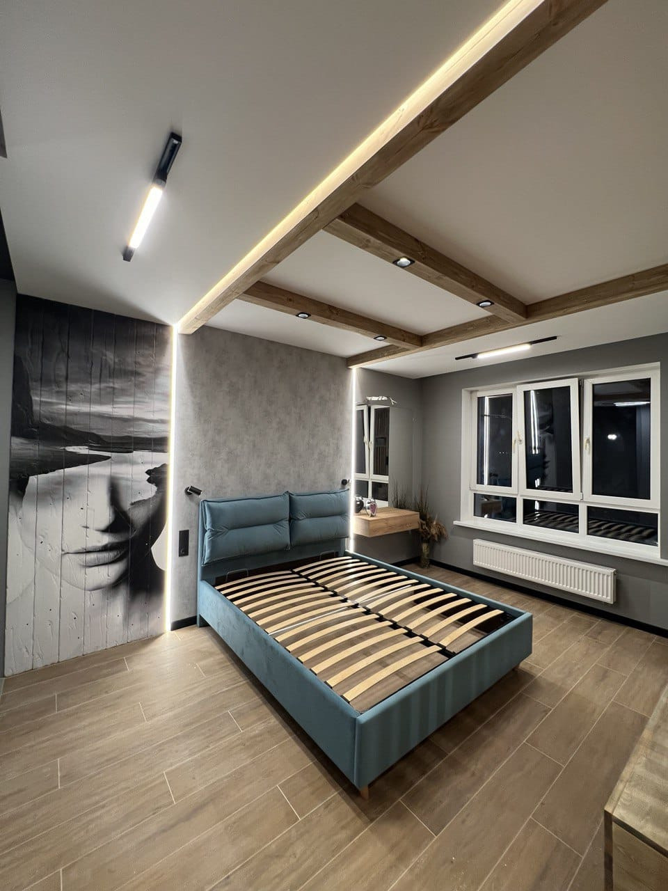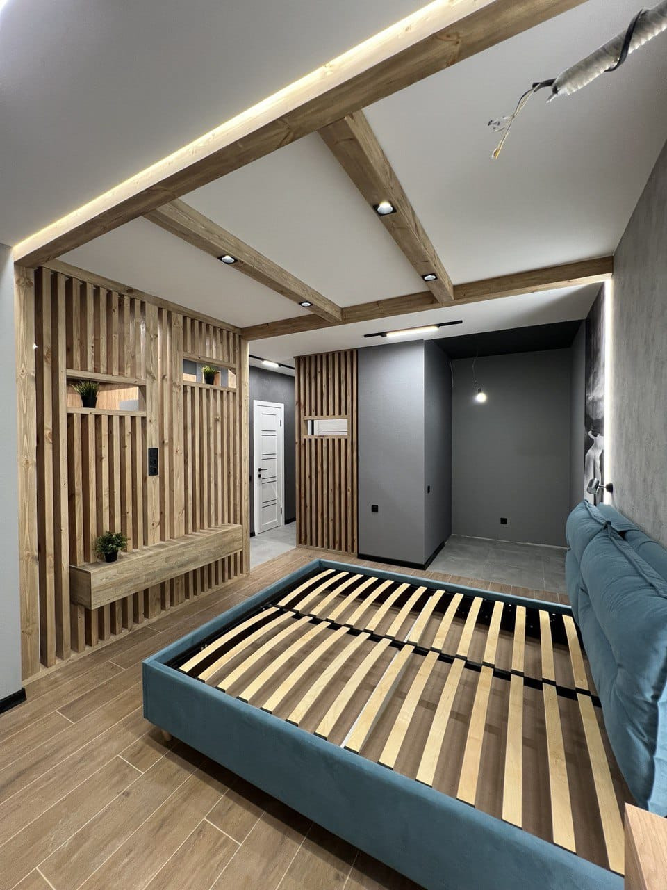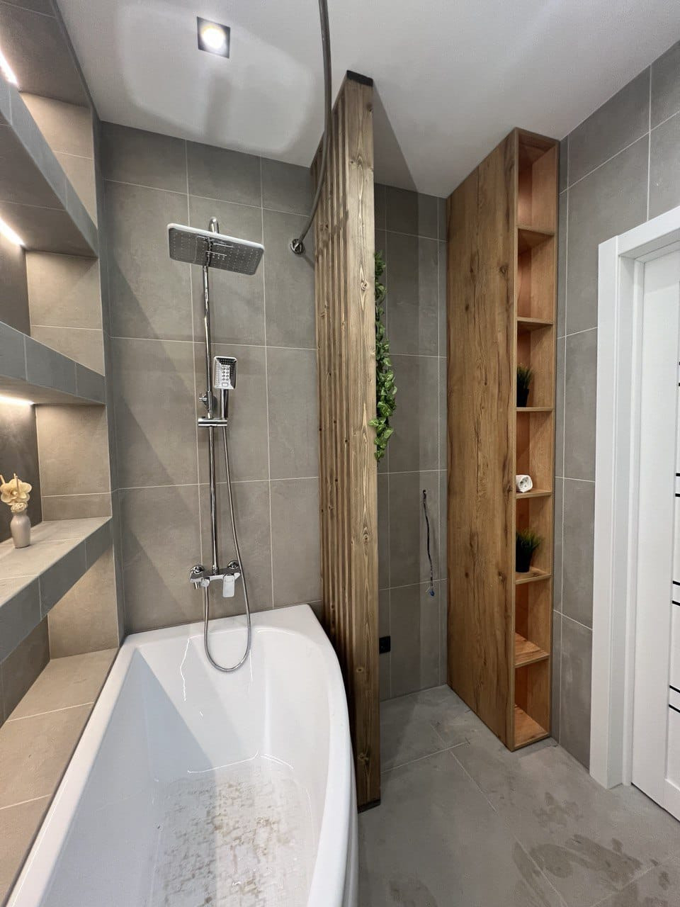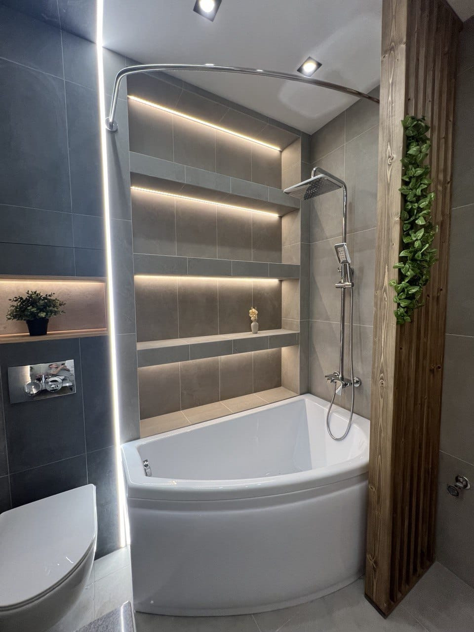 В квартире ремонт, который выполнен по дизайн- проекту. Квартира практически полностью укомплектована- кухонный гарнитур, холодильник, кровать, телевизор, посудомоечная машина, духовой шкаф и варочная панель, бойлер. Много различного освещения и подсветок, различные полки для хранения, декоративные рейки, встроенный стол на кухне. На полу плитка, в санузле также всё в плитке, инсталляция, тропический душ, вывод под стиральную машину.