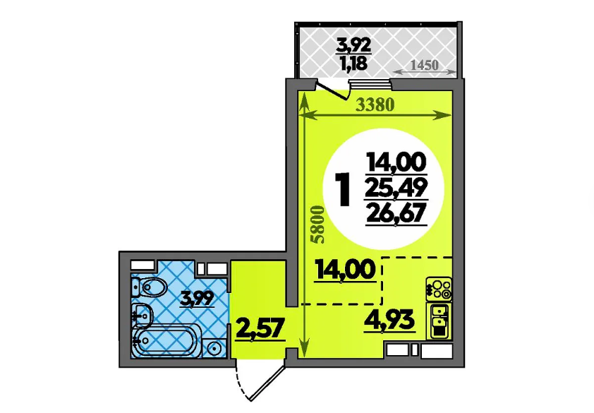 Общая площадь 26.67 м2