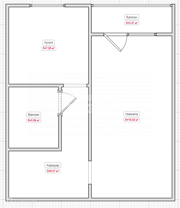 Площадь объекта 32.5м2. Высота потолков 3м. Жилая площадь 15.4м2. Кухня 7.2м2.