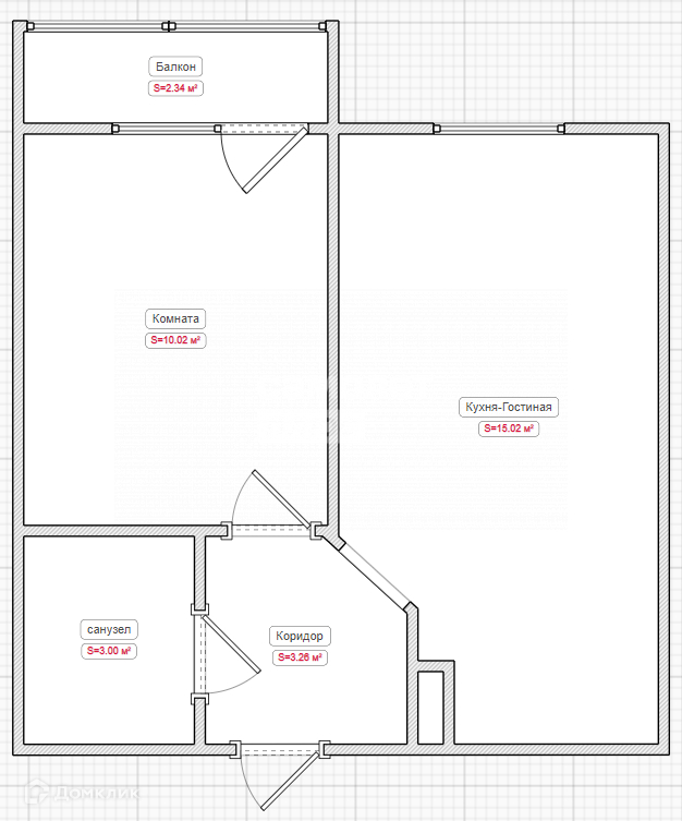 Площадь объекта 32,2м2. Высота потолка 2,8м. Кухня-Гостиная 15м2. Комната 10м2.