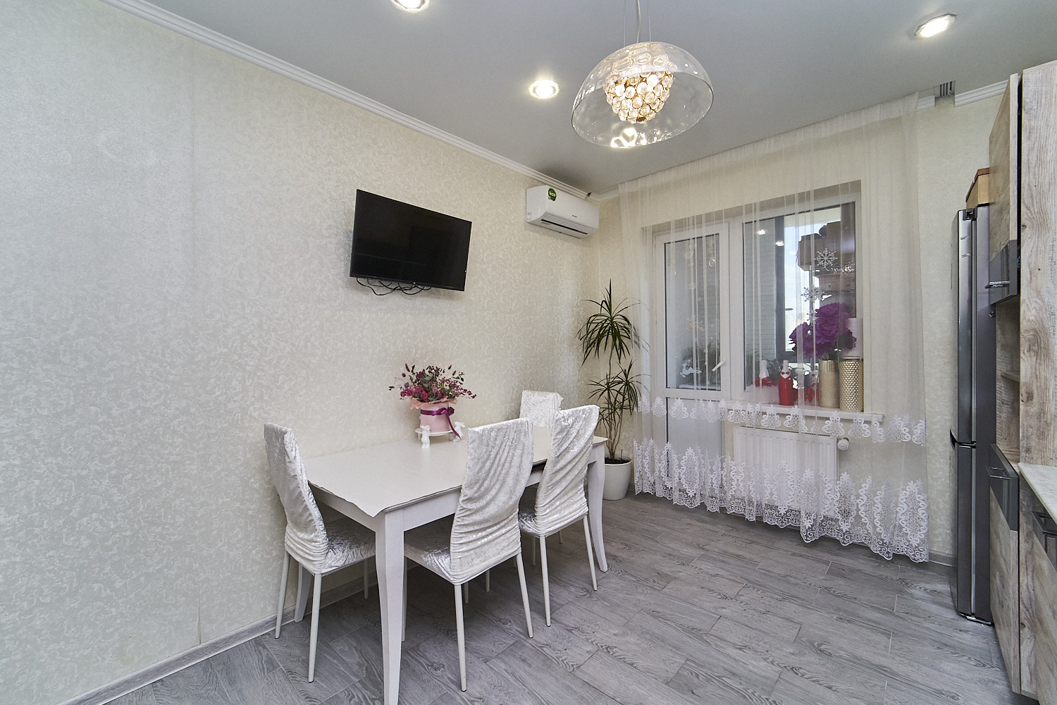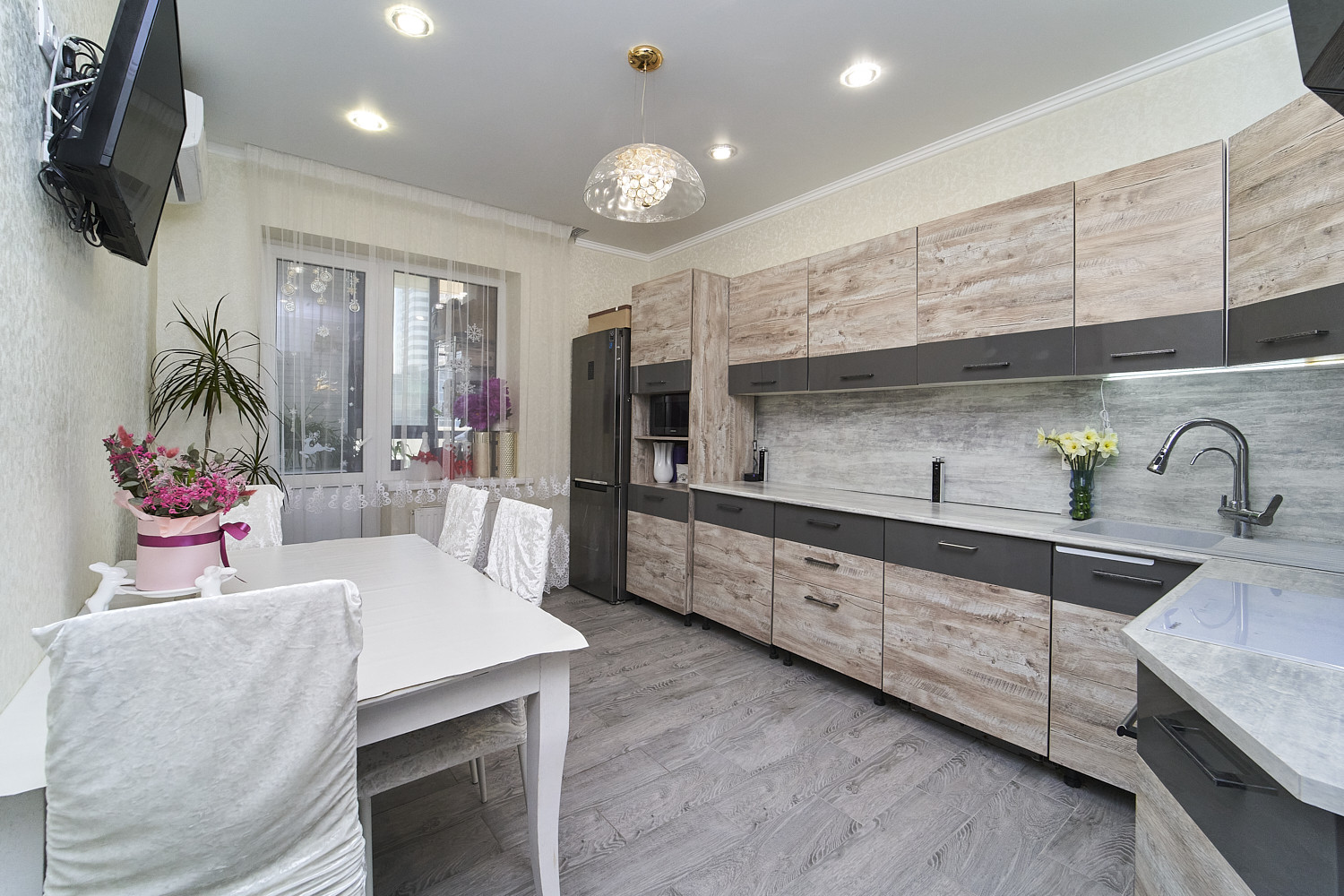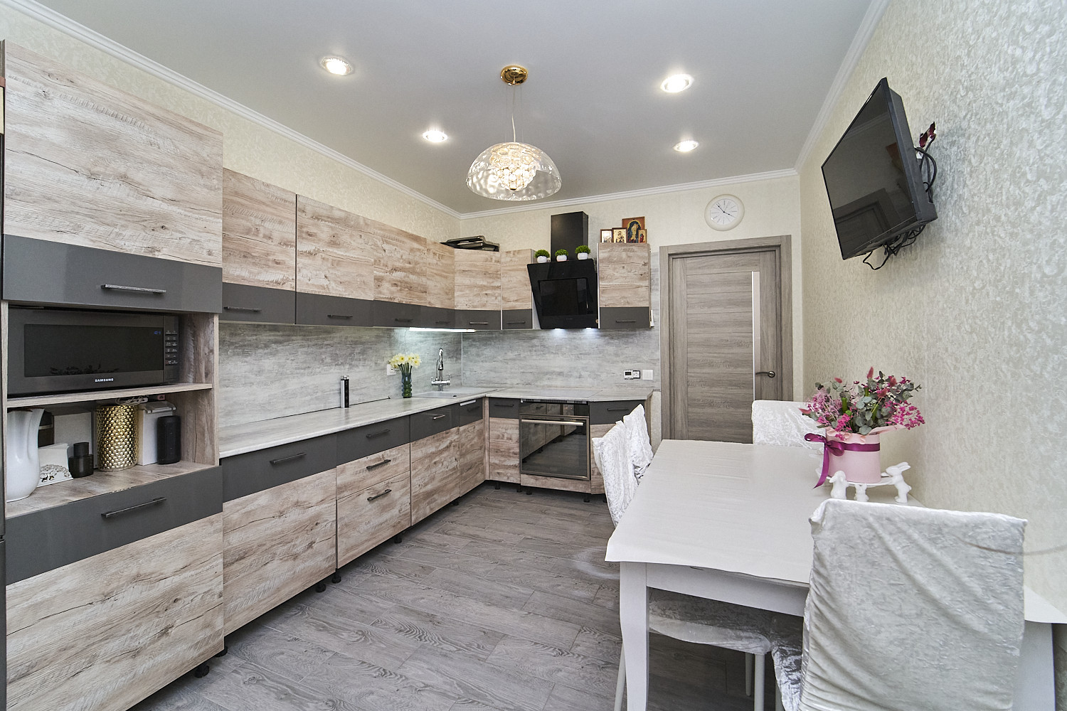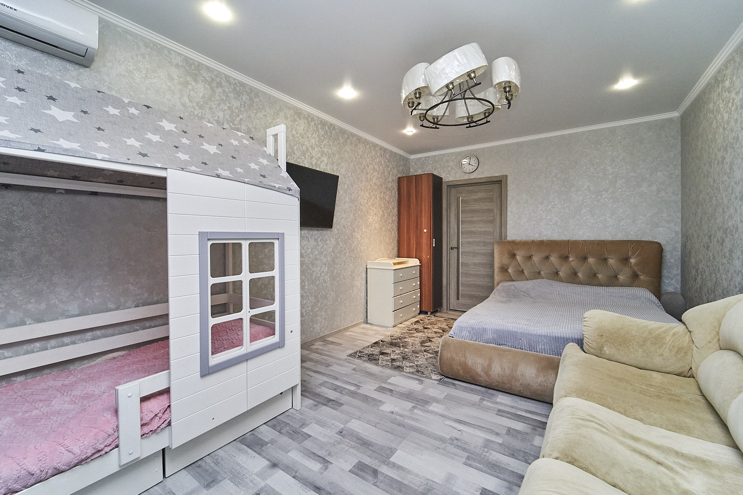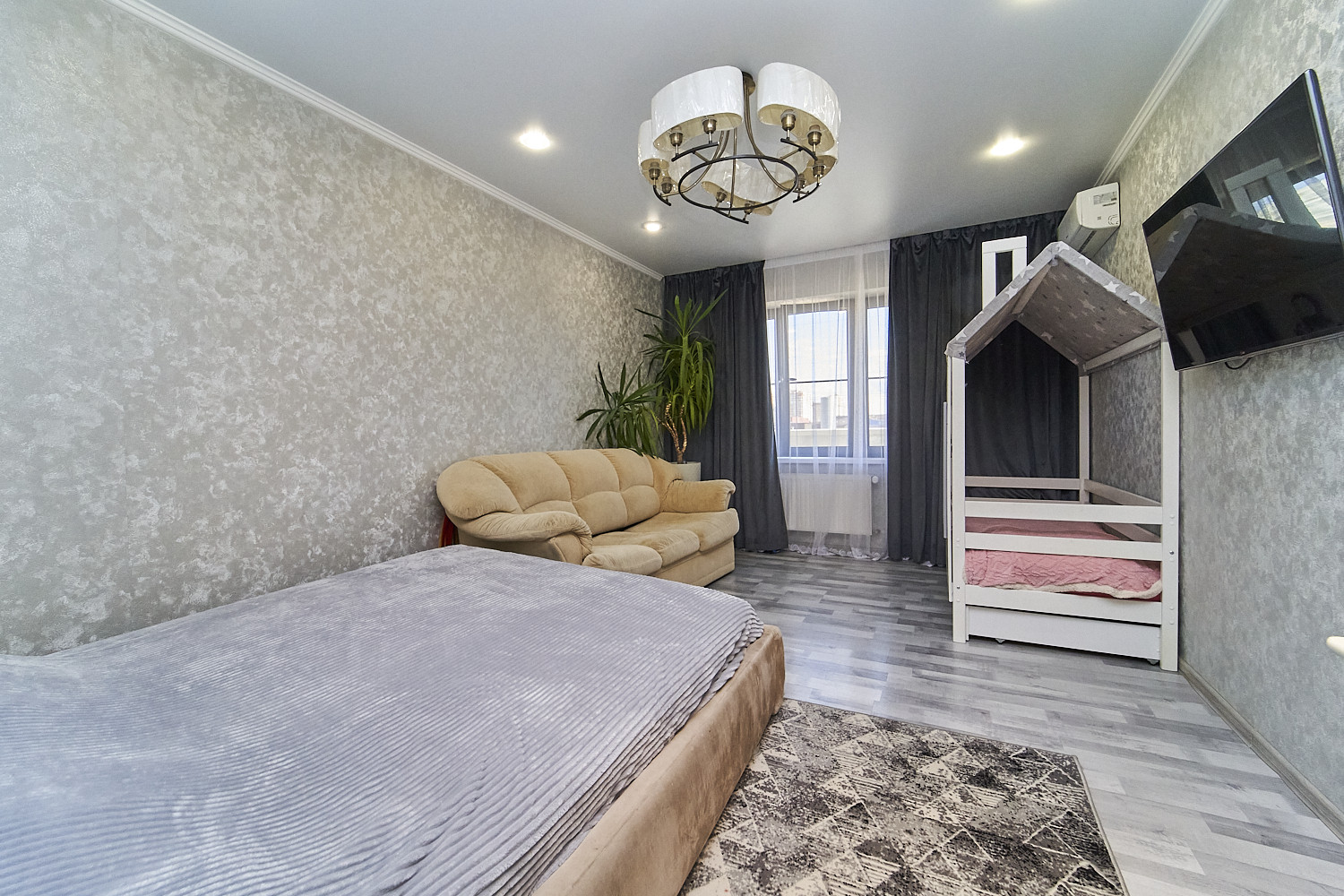 Большая жилая комната, кухня, гардеробная.