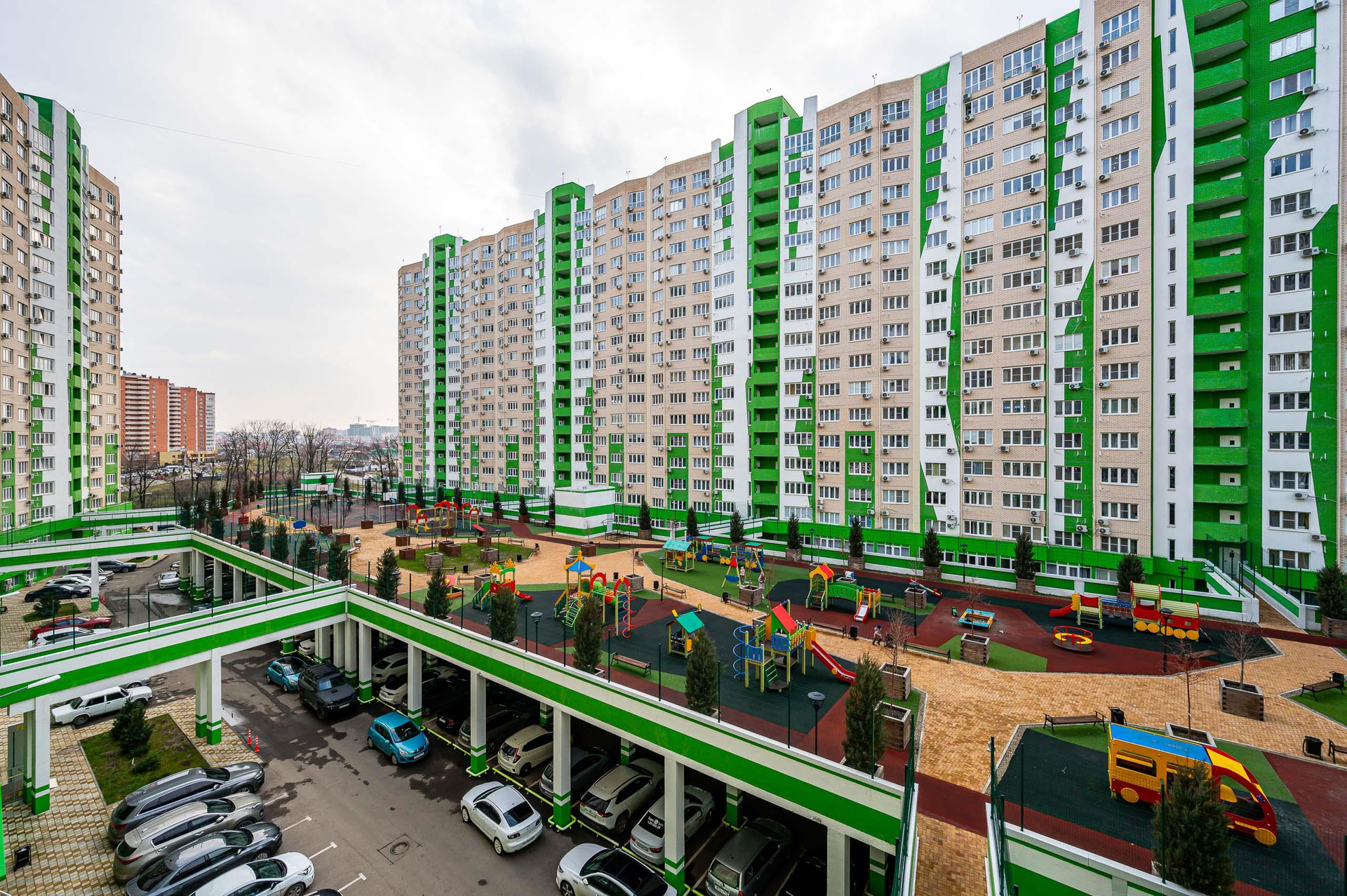 Закрытая территория комплекса, консьерж, стилобат с прогулочными и игровыми зонами на весь двор, видеонаблюдение по всему периметру. Комплекс находится в 8 минутах пешком от самого красивого парка Европы "Парка Краснодар".