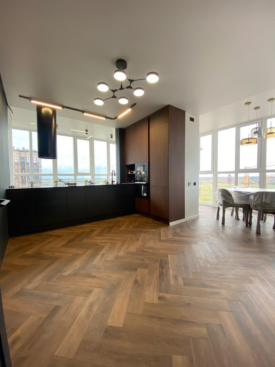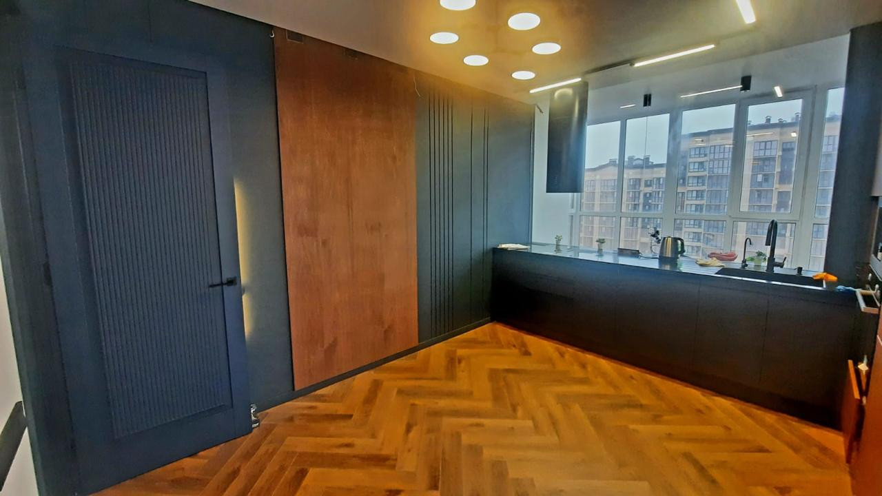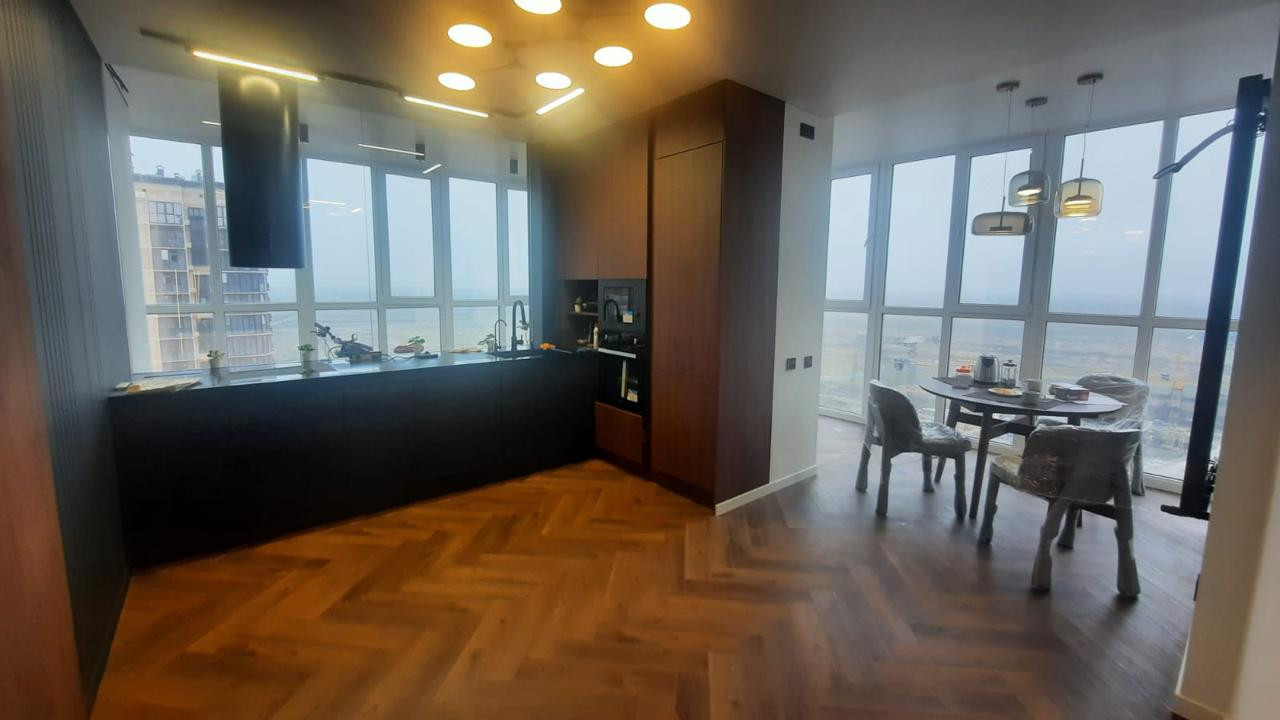 В квартире дизайнерский ремонт из дорогих материалов. Встроенная техника на кухне, холодильник., посудомойка СВЧ , мебель сделана на заказ . Краны с датчиками, подсветка с датчиками движения в коридоре и ванной, потолочная акустическая система по всей квартире, видеофон вход в подъезд и квартиру.   Электро карнизы, пол с подогревом, дизайнерские радиаторы отопления, подоконники и столешница из камня. Панорамное остекление с тонированным стеклом.