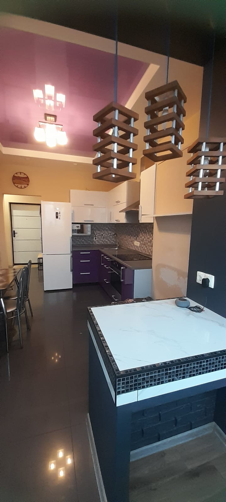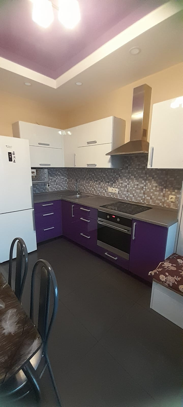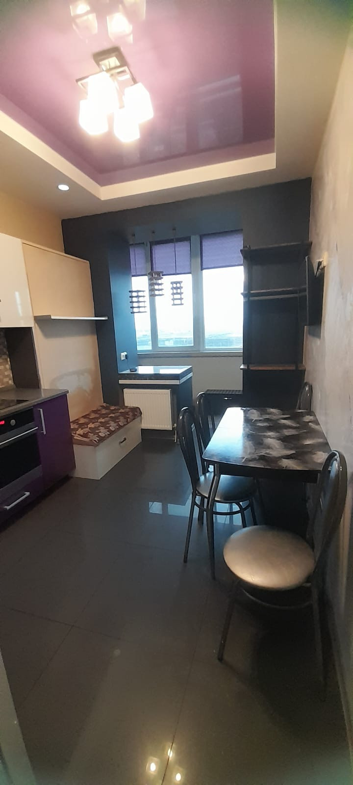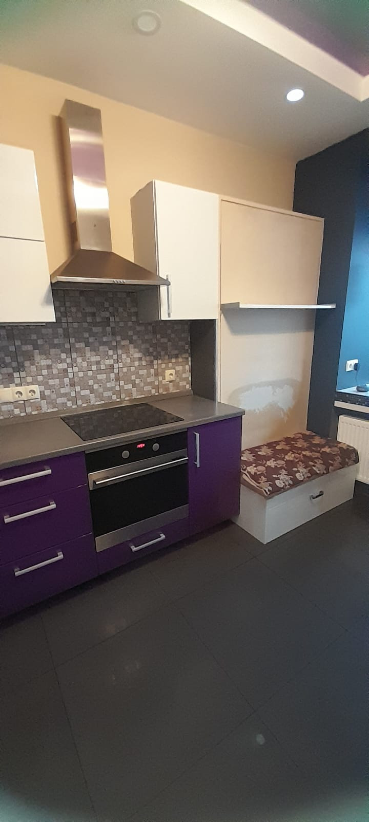 Кухня-гостиная оборудованна обеденной зоной, встроенную откидную кровать-кушетку можно использовать как спальное место. Удобные кухонные шкафы с газлифт механизмом.