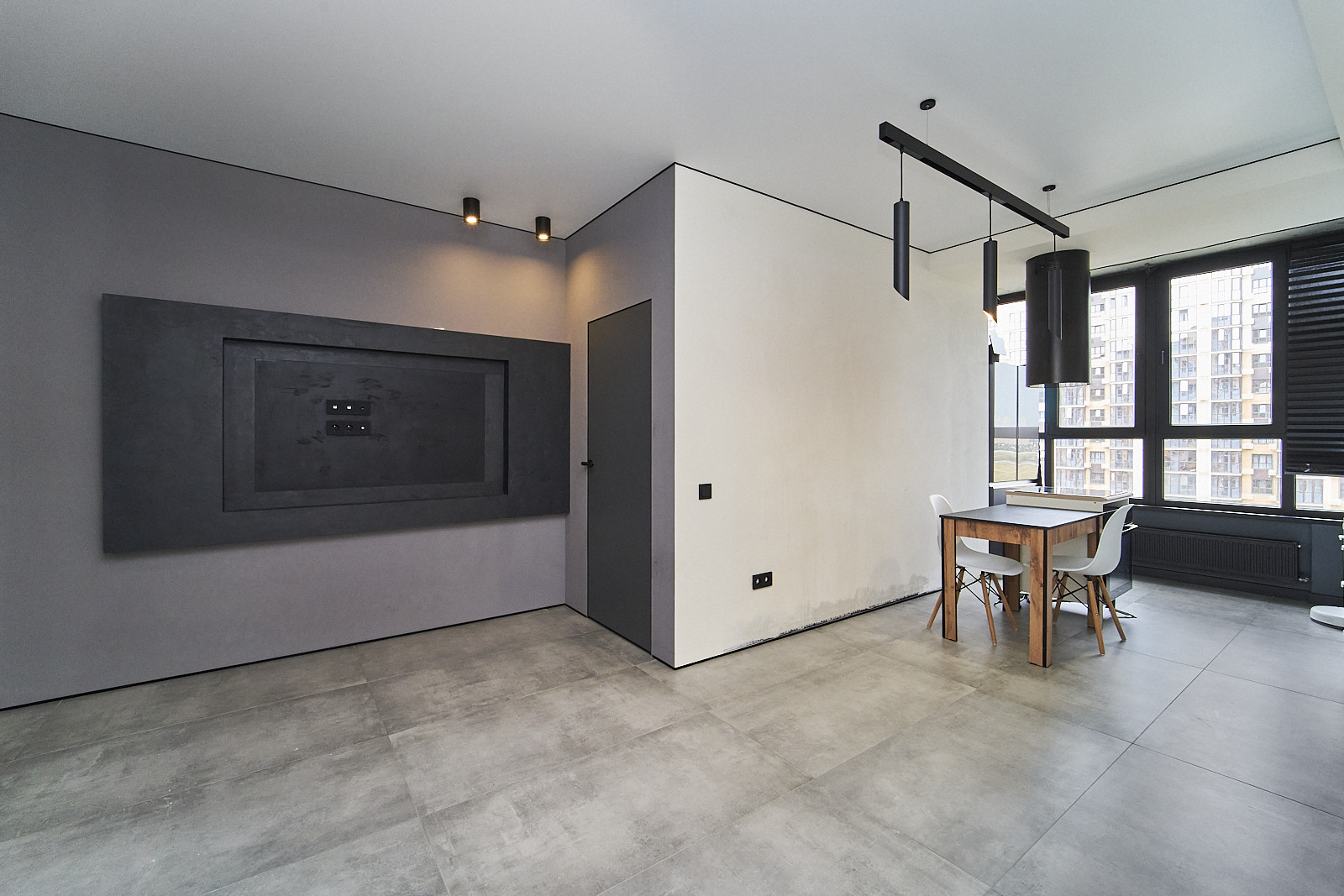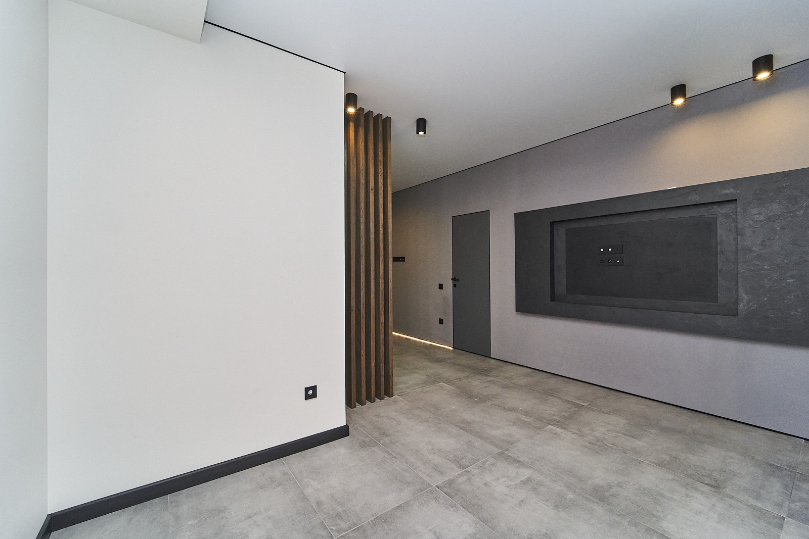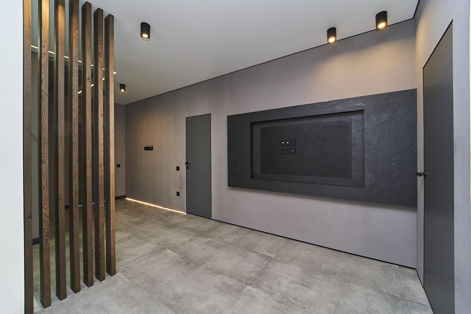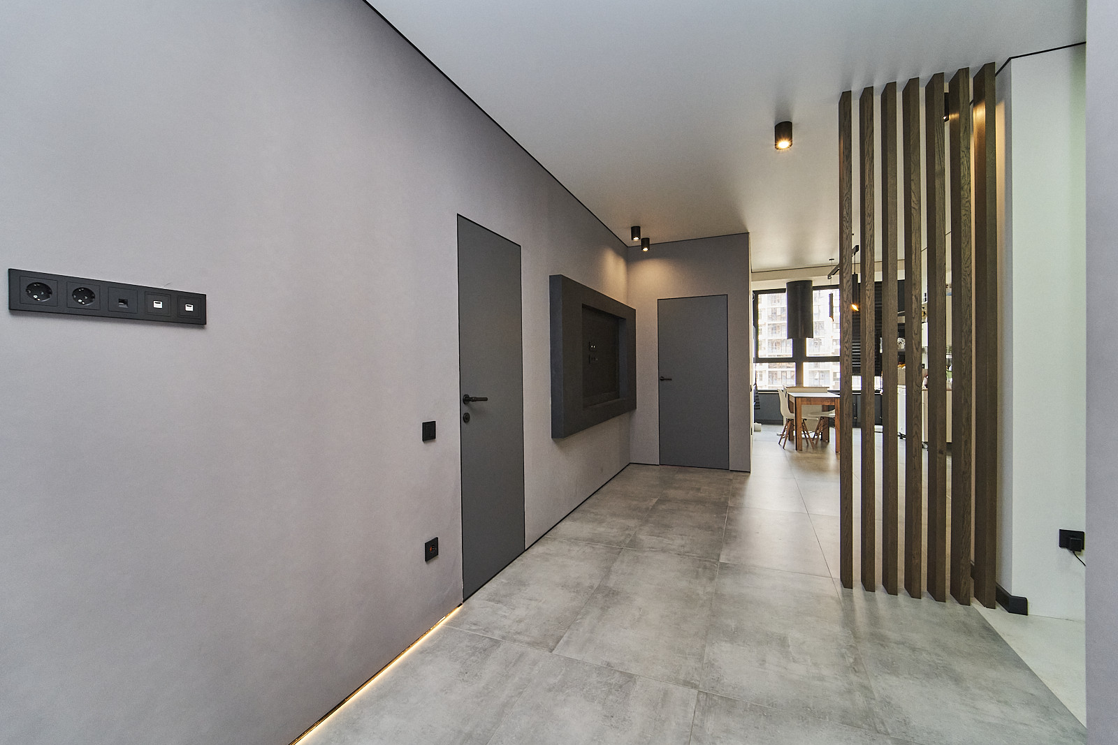 Квартира также обладает ламелями из дуба между гостиной и прихожей, а управление освещением и системой кондиционирования осуществляется с помощью интеллектуальной системы «Алиса». Шпон под телевизор выполнен из натурального вулканического камня, придающего интерьеру изысканность.