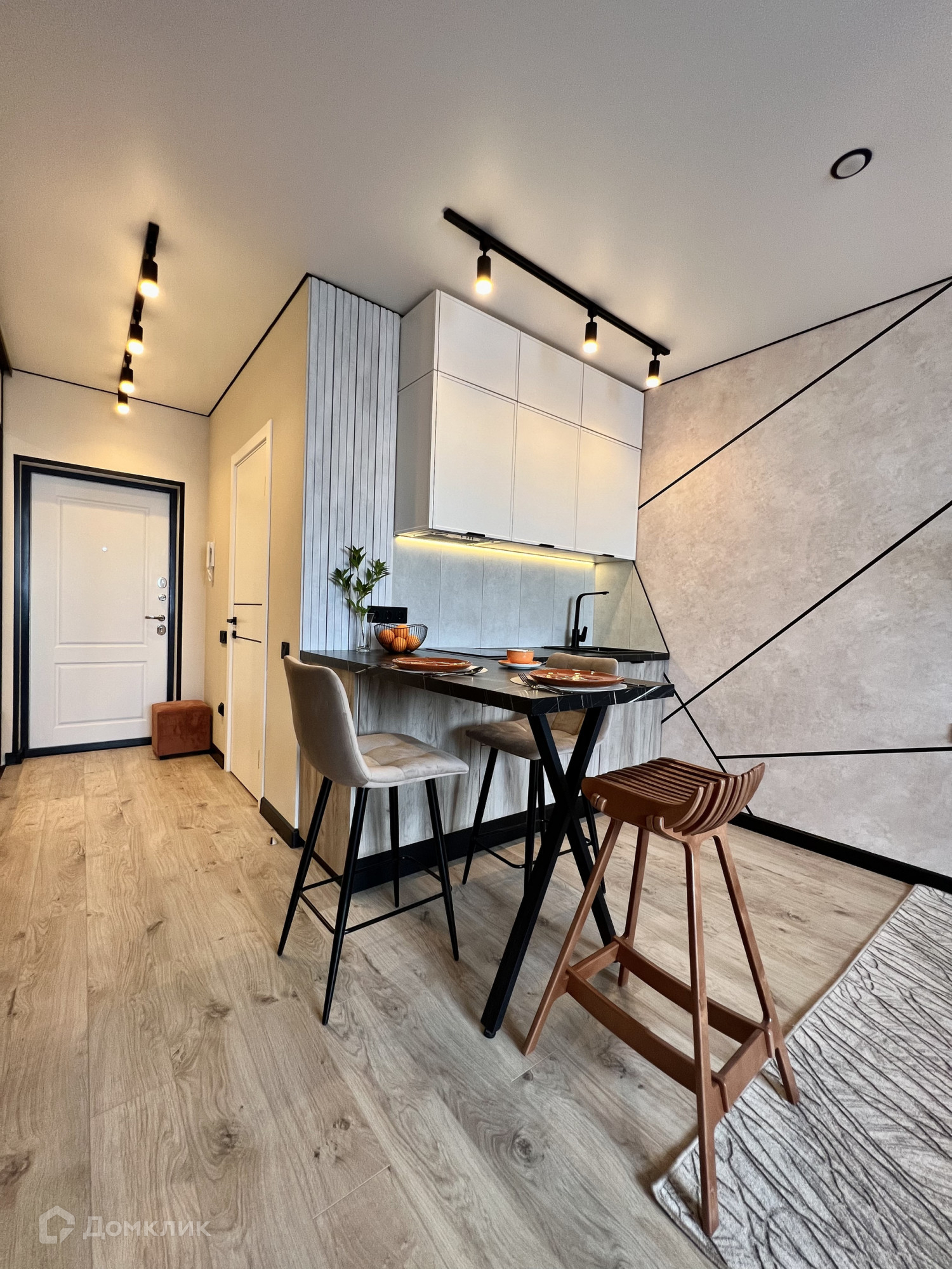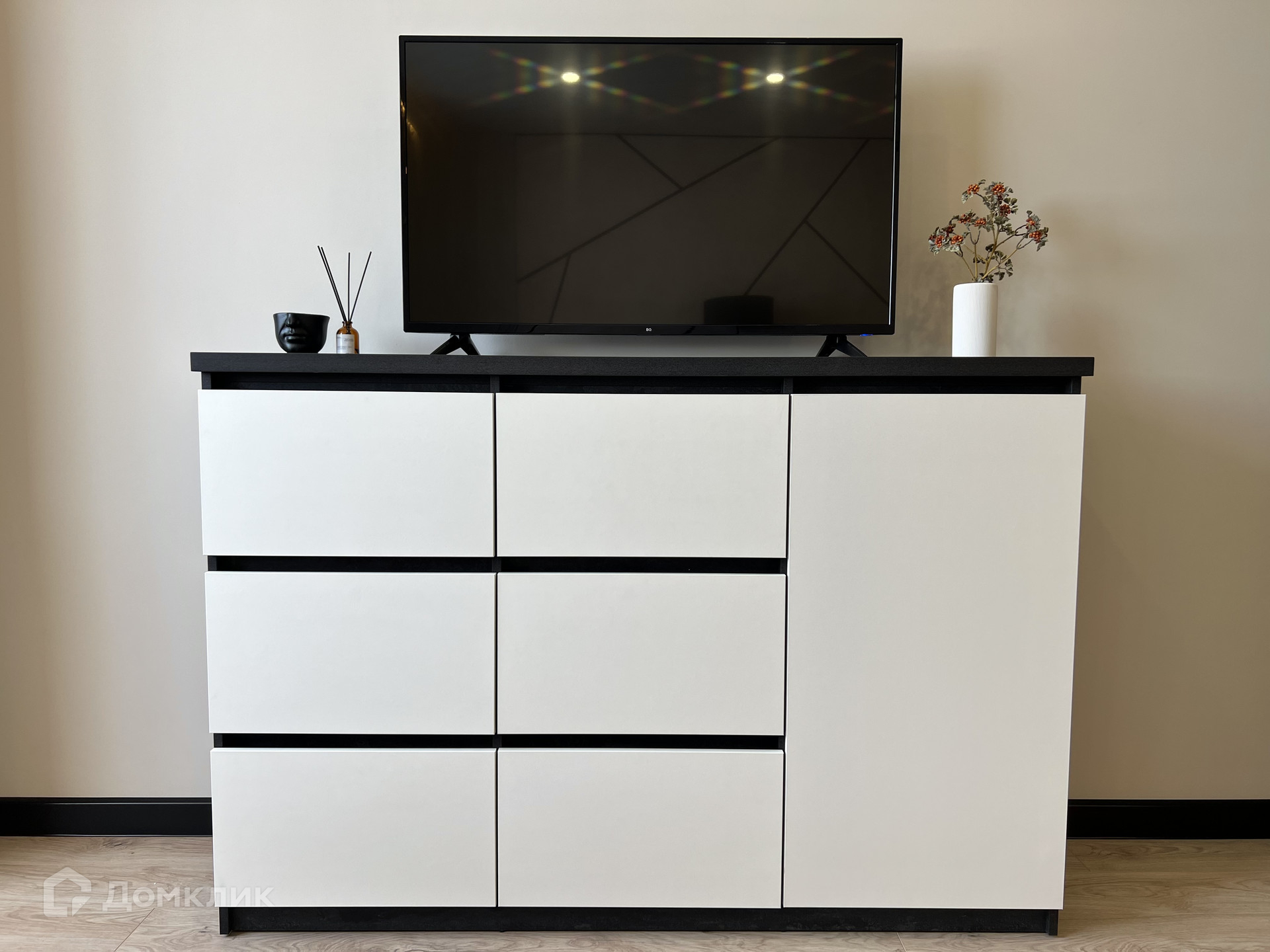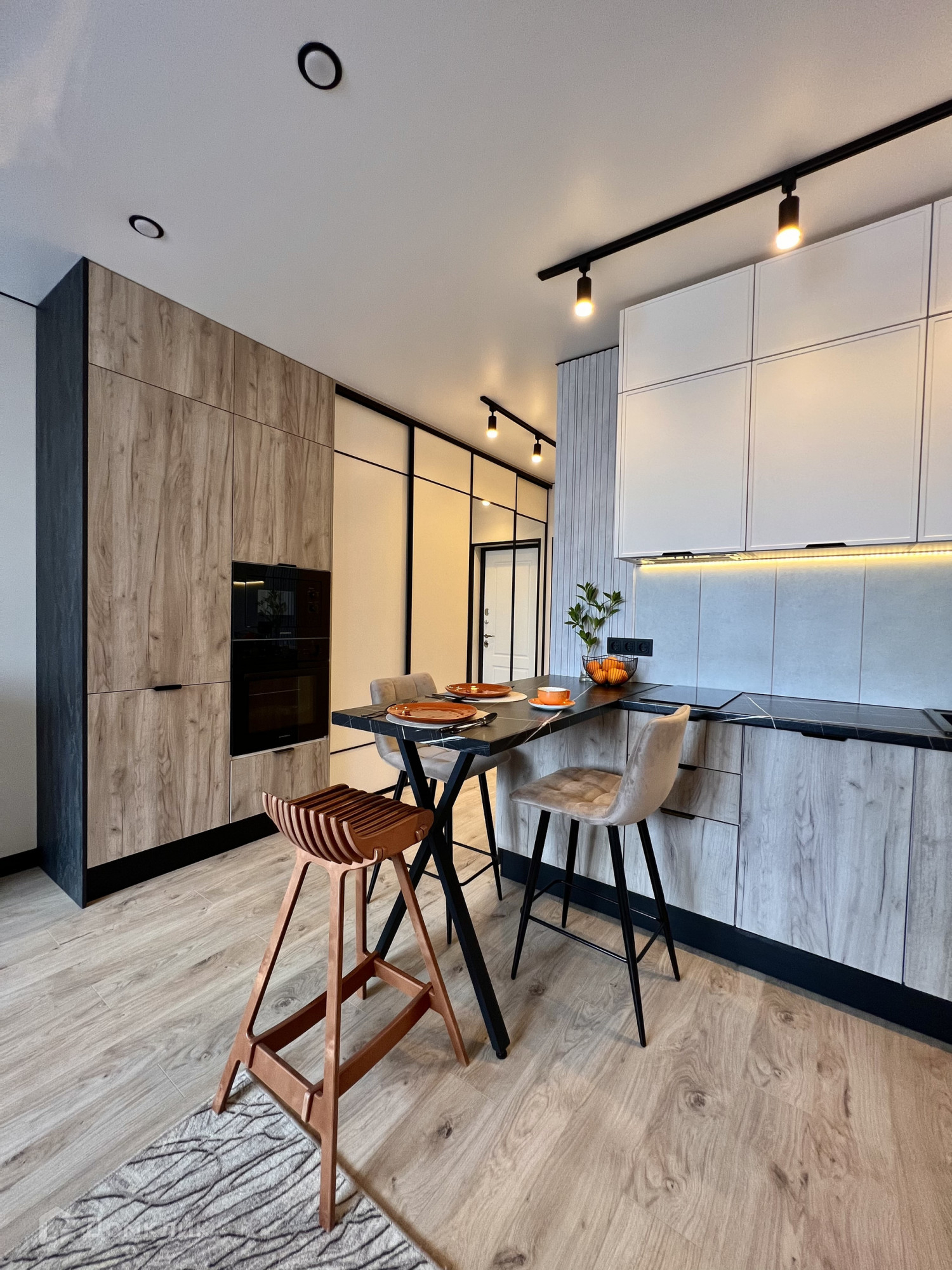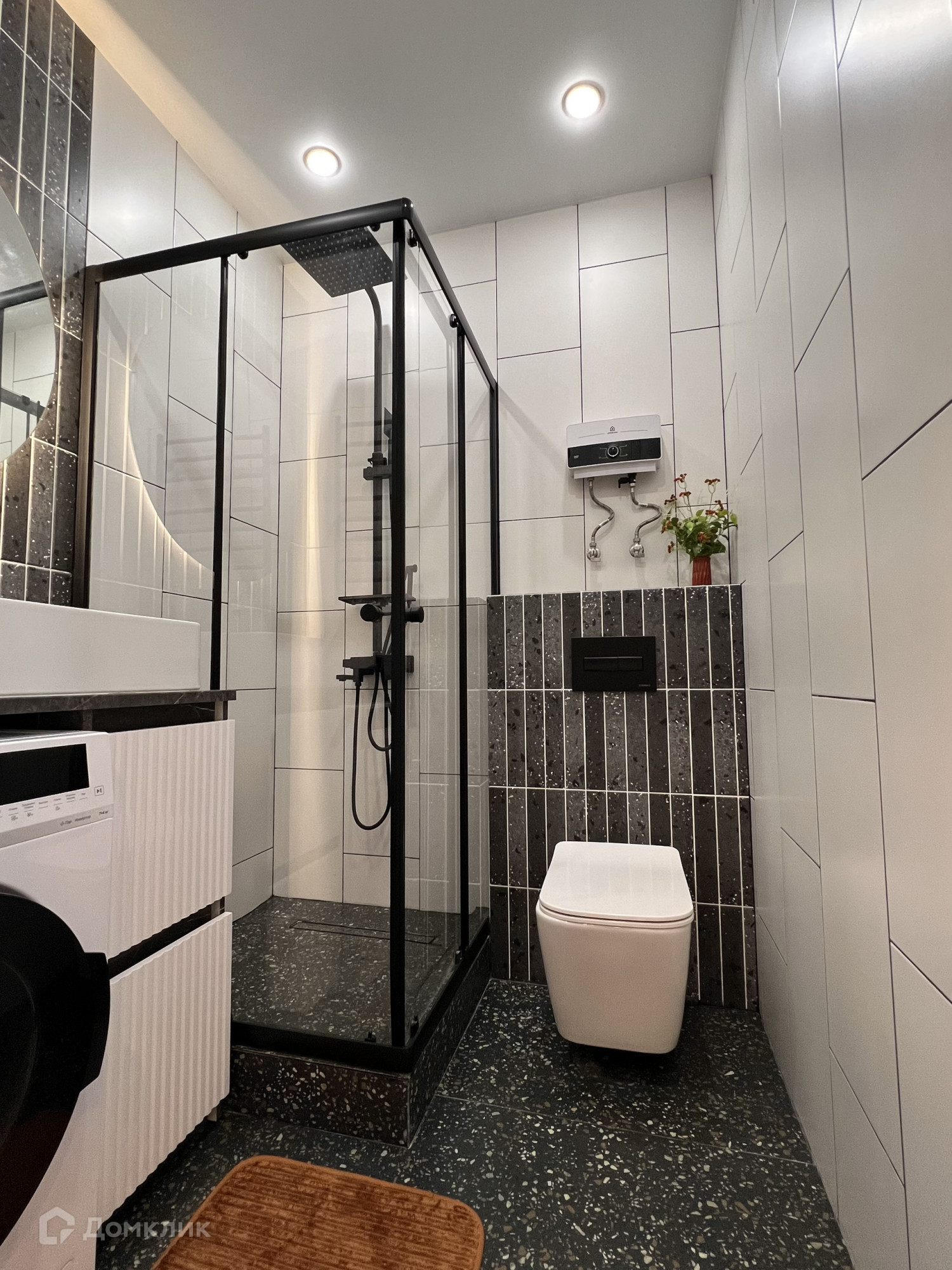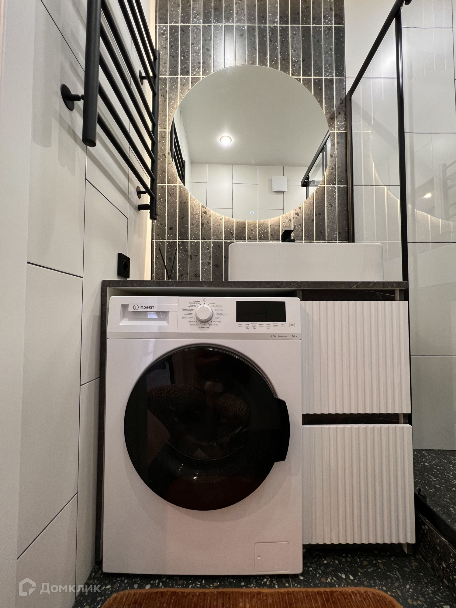Есть вся необходимая бытовая техника: сплит-система, смарт-тв, встроенный холодильник, микроволновка, духовка, индукционная варочная поверхность, вытяжка, посудомоечная машина, стиральная машина с функцией сушки белья, проточный водонагреватель на случай отключения горячей воды.