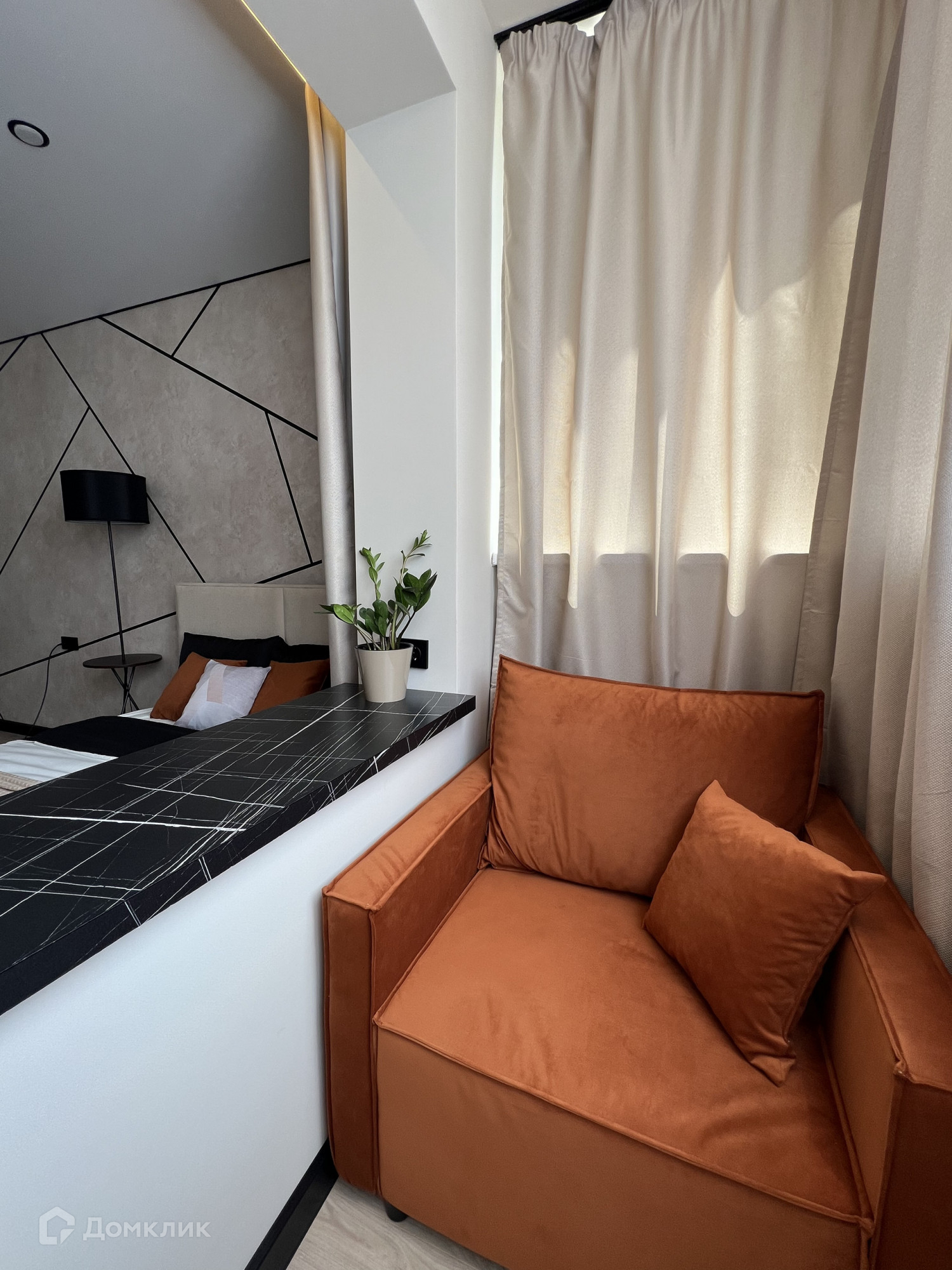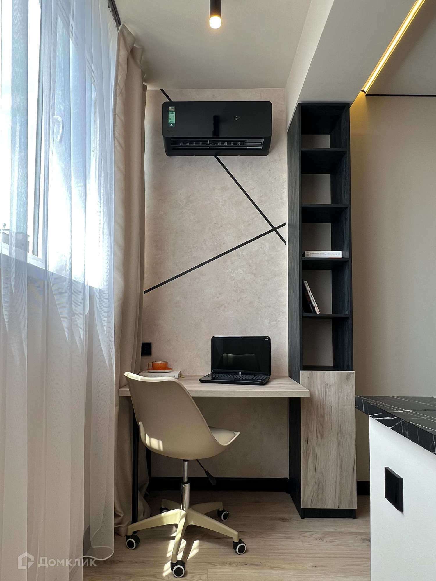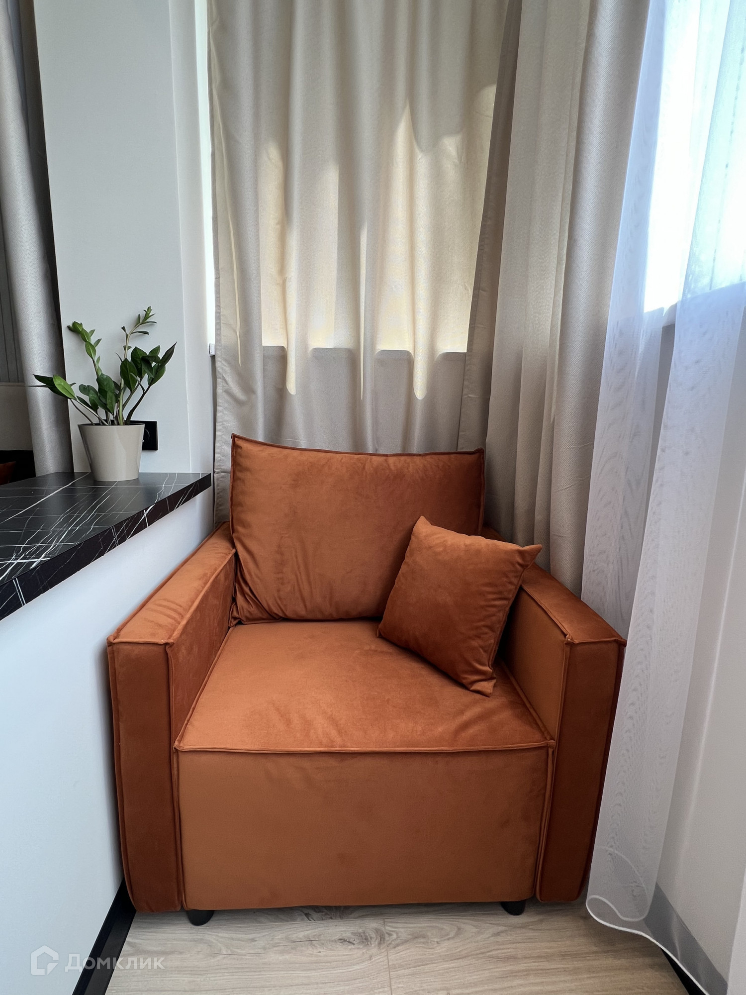 На лоджии обустроена уютная рабочая зона с большим креслом, которое также раскладывается и служит дополнительным спальным местом. На лоджии и в санузле установлены теплые полы.