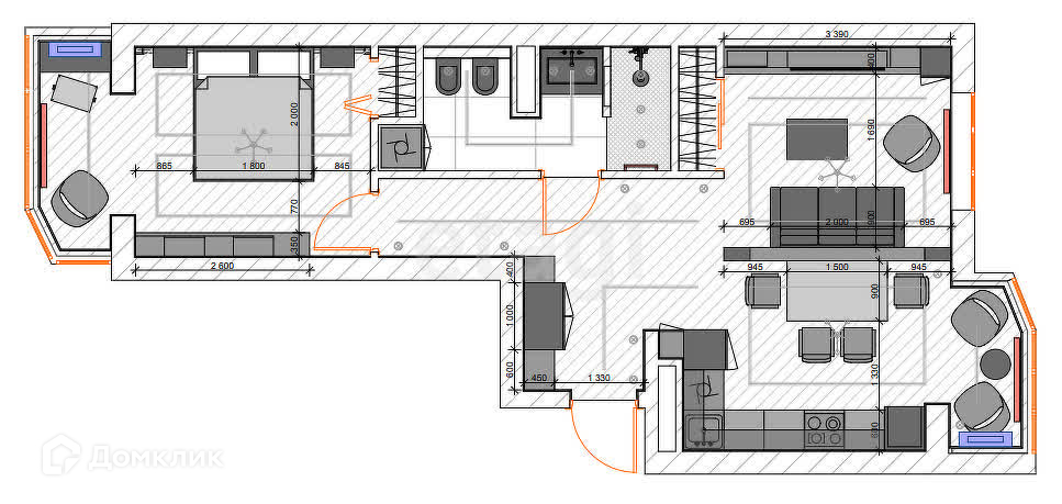 Все материалы, бытовая техника, элементы фурнитуры подобраны и реализованы с особенным тщанием и бескомпромиссным вниманием к мелочам.