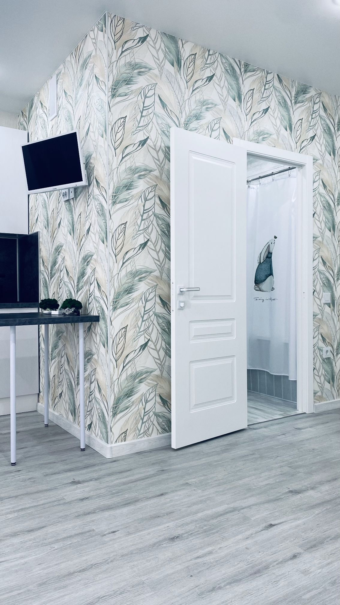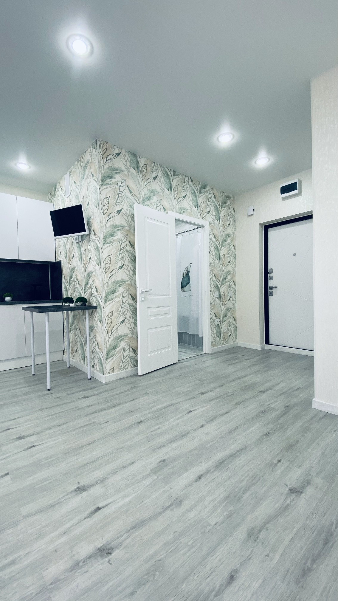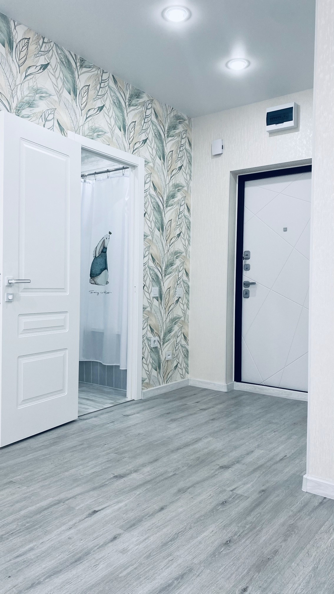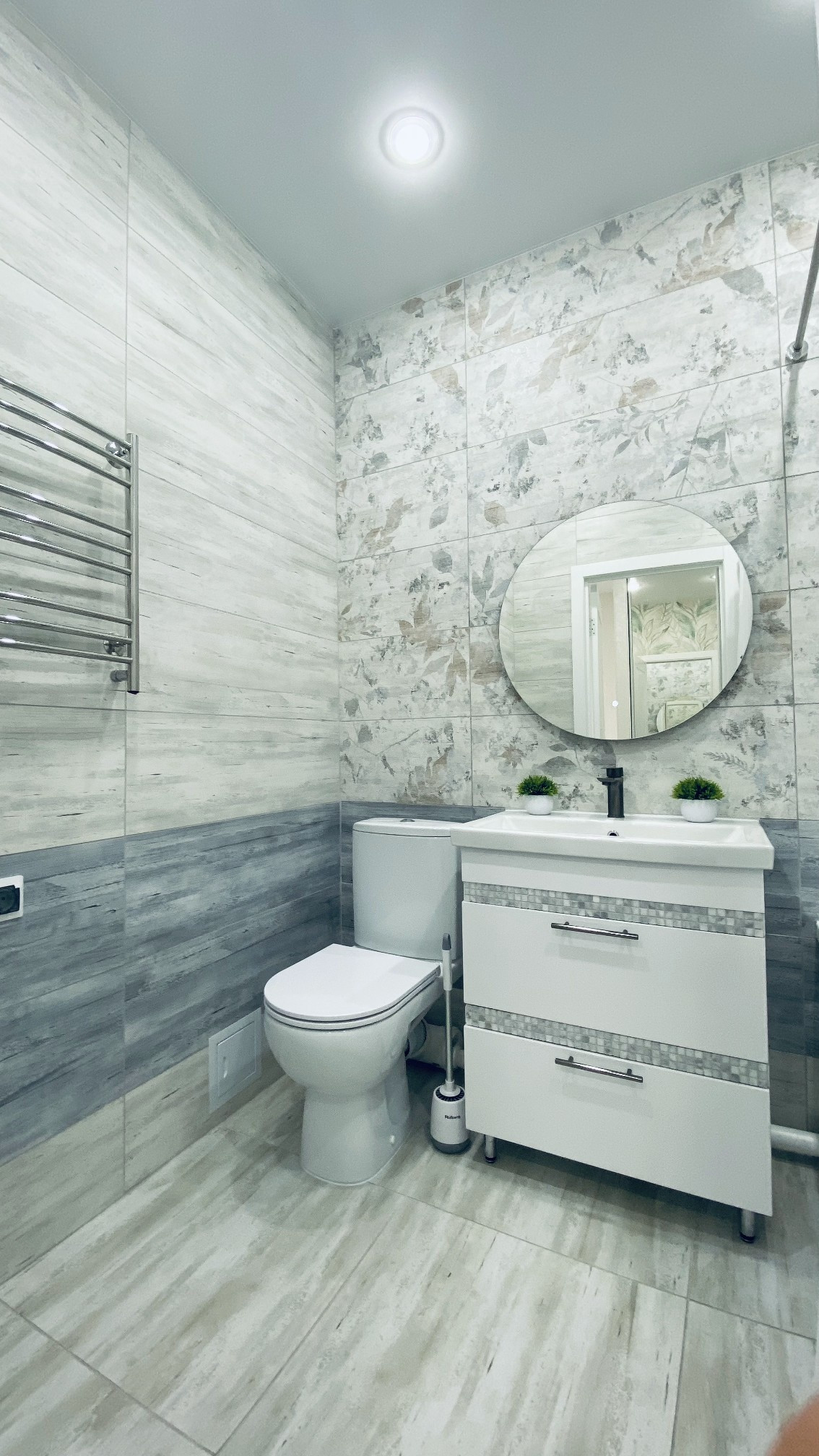 В ванной керамогранит, в комнате на полу ПВХ плитка, качественная современная сантехника, ванная и унитаз из фарфора производство Герамния, во всей квартире установлены стеклянные розетки с защитой от детей и много других плюсов.
