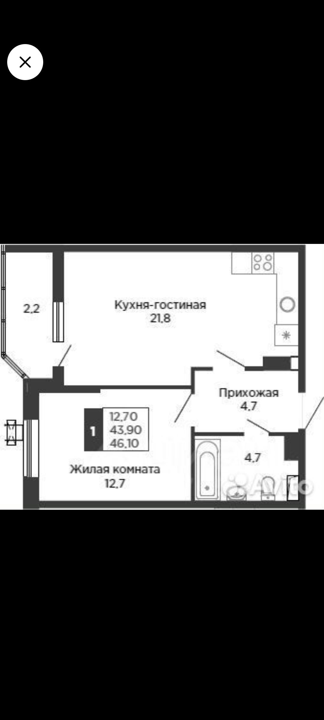 Общая площадь 45.5 м2