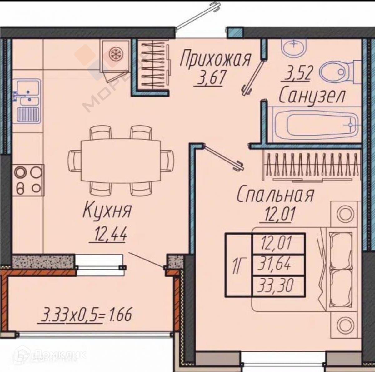 Общая площадь 32.5 м2