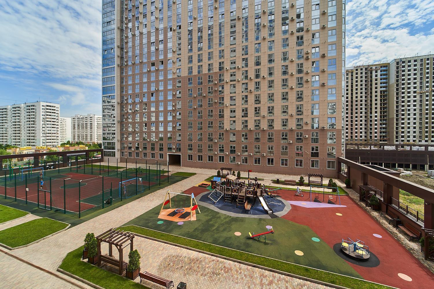 Жилой комплекс построен по индивидуальному проекту - установлены панорамные лифты, закрытые дворы на стилобате на уровне 4го этажа с детскими, спортивными площадками и зонами отдыха. На первых этажах расположен крытый паркинг, магазины, салоны красоты, аптеки.
