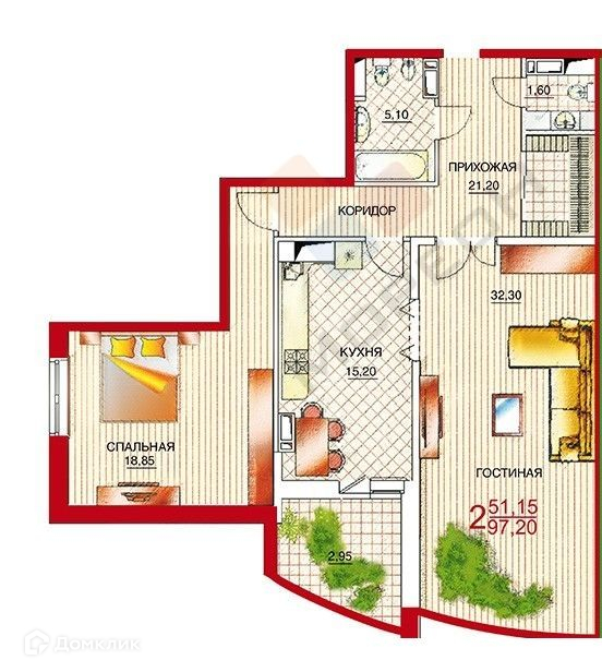 Жилая площадь 51.2 м2