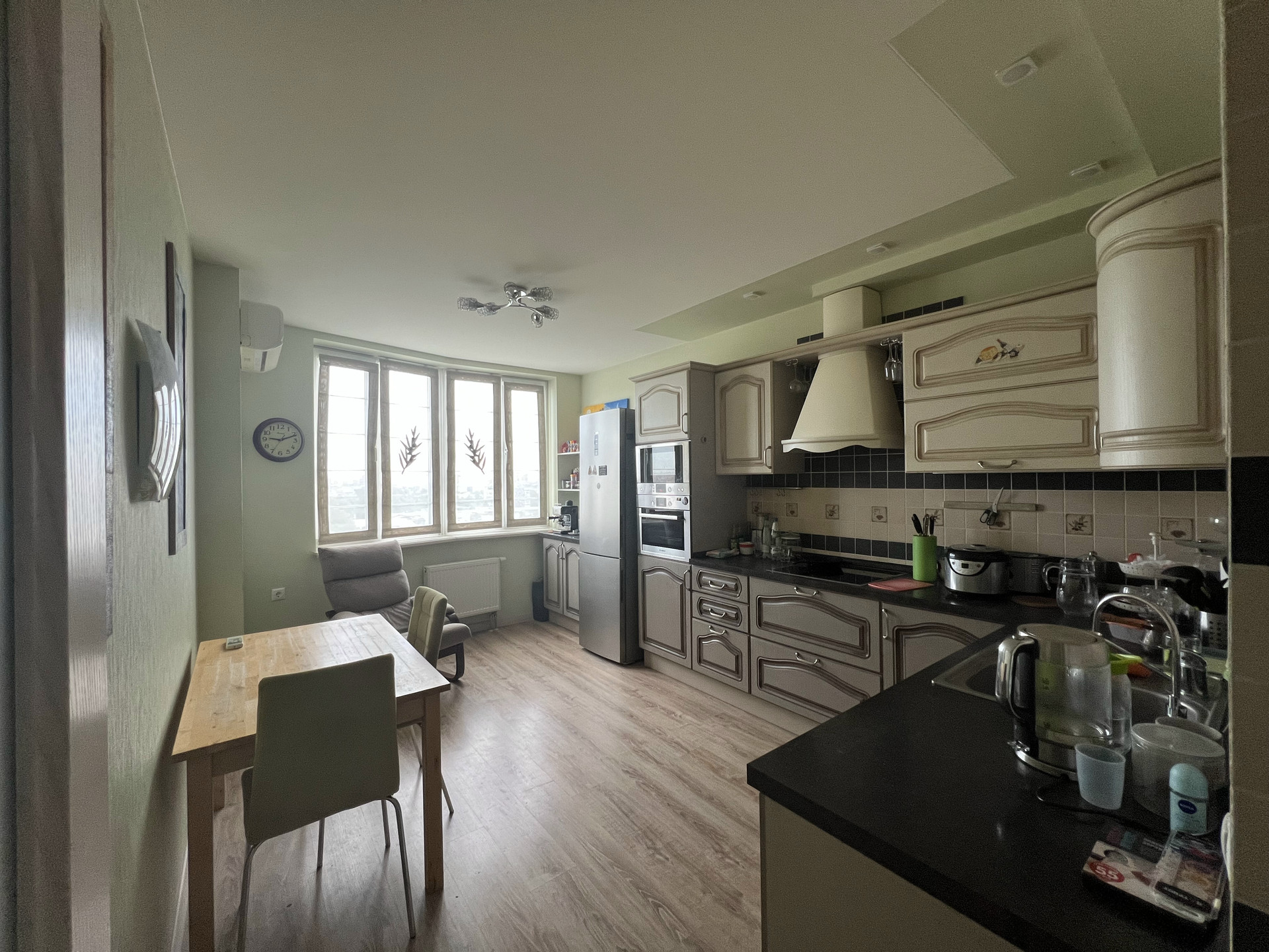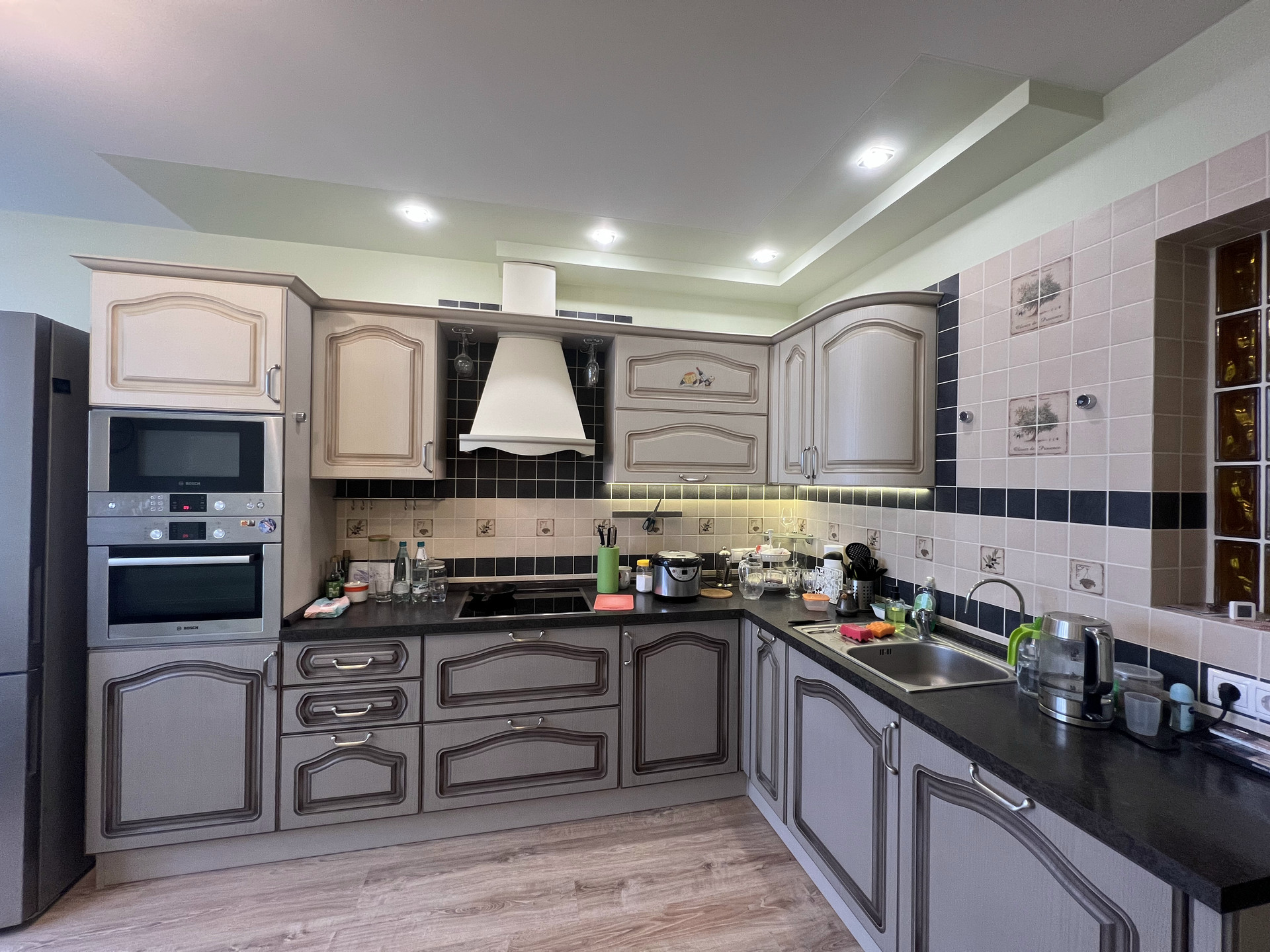 Встроенная плита с индукционными конфорками, духовка (BOSCH), микроволновка (BOSCH), посудомойка (BOSCH).