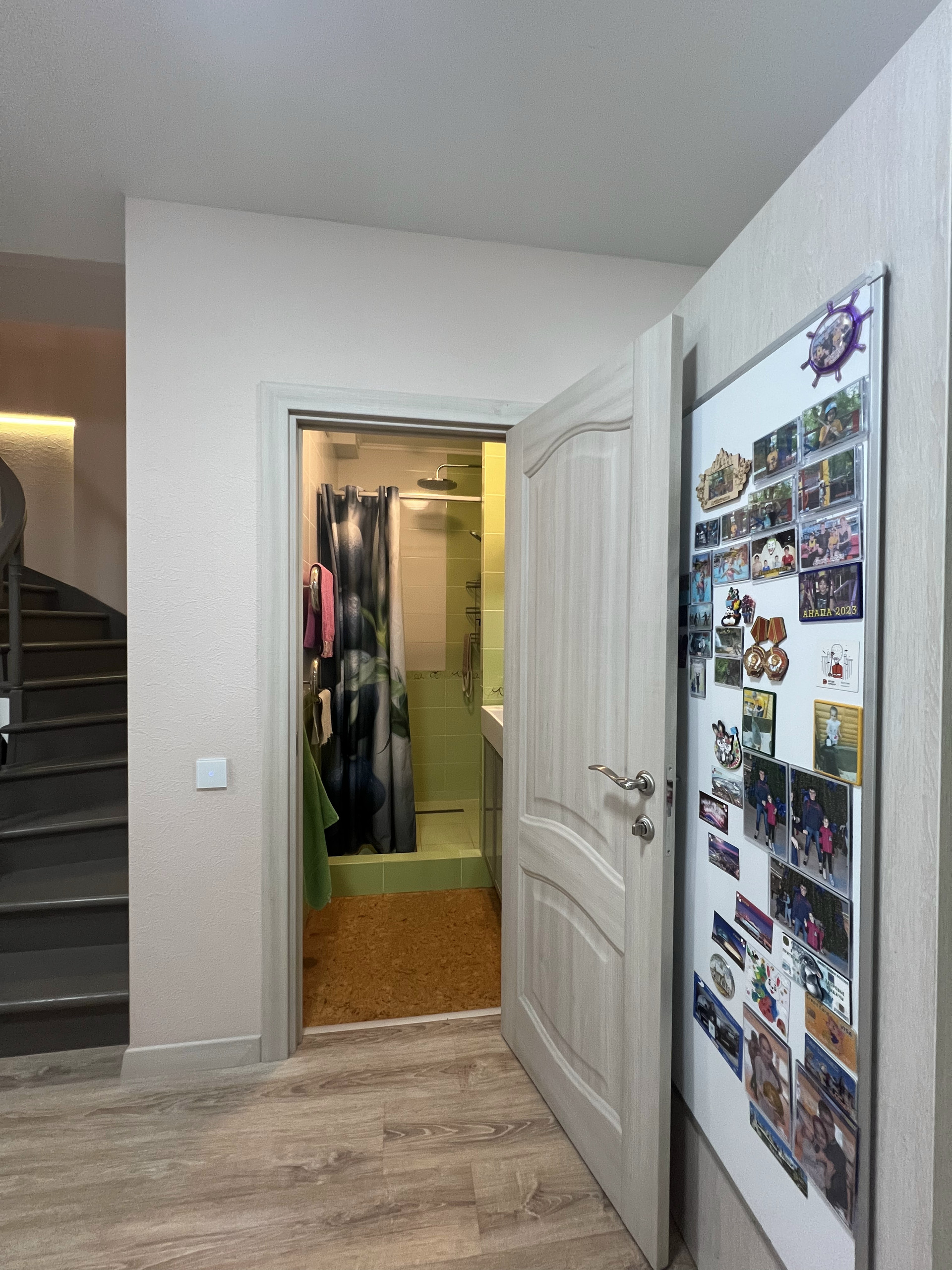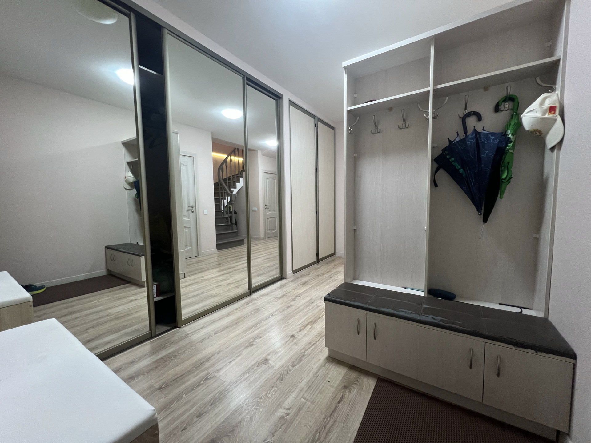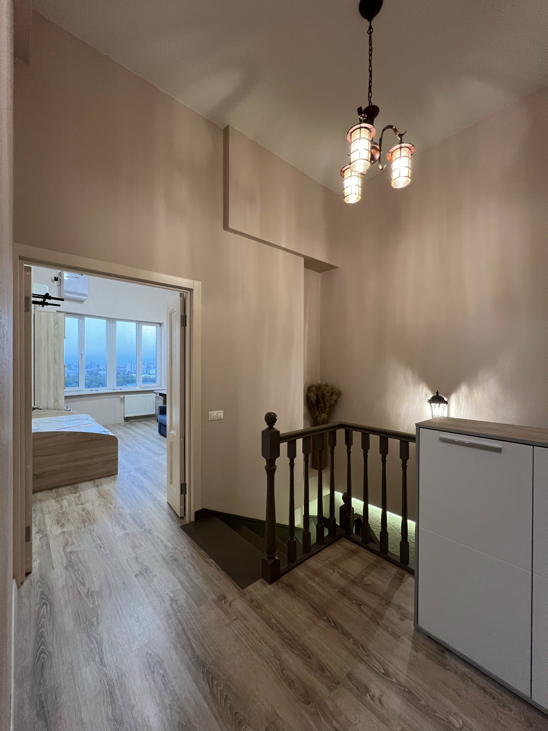 Атмосферная подсветка в гостиной, на лестнице, на кухне, в спальне.