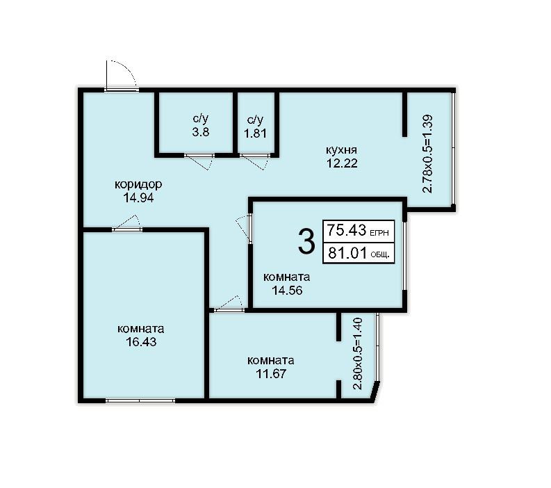 Общая площадь 75.5 м2
