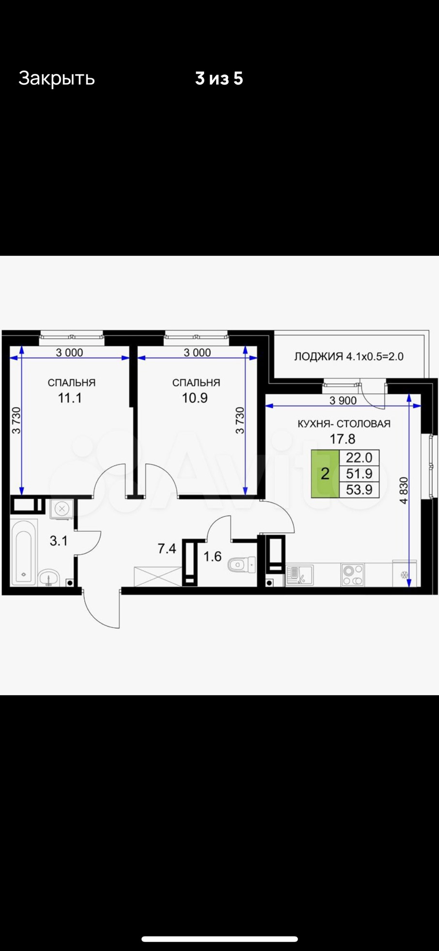 Общая площадь 53 м2