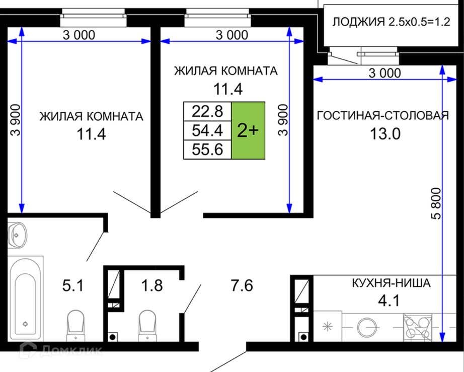 Общая площадь 55.6 м2