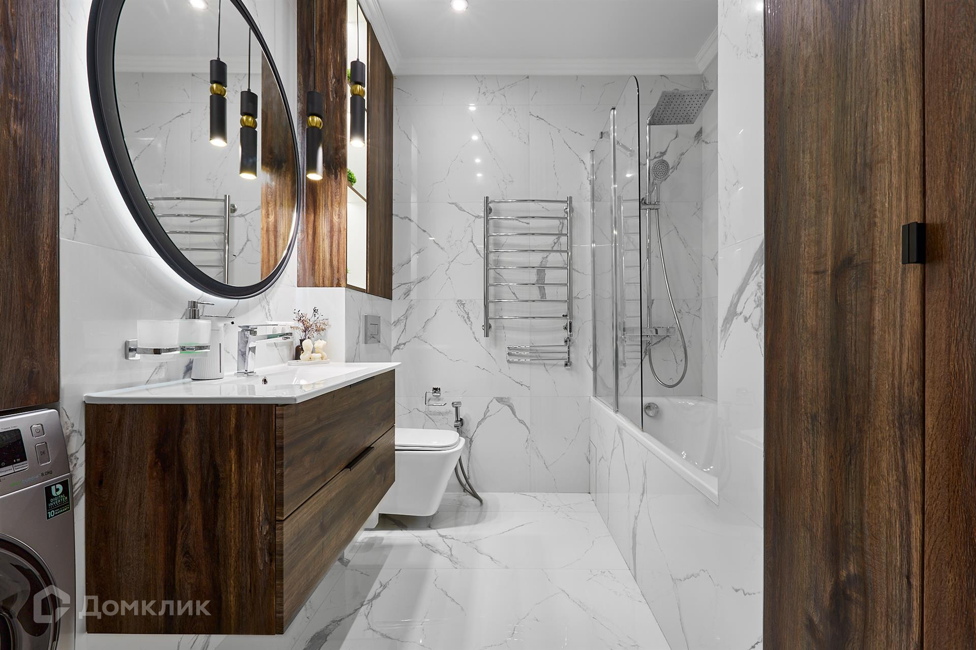 - в санузле выложена испанская широкоформатная плитка керамогранит 1,2 м на 60 см, вся мебель встроенная под заказ, теплые полы;