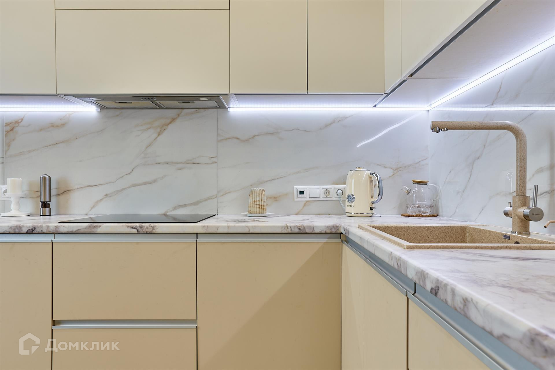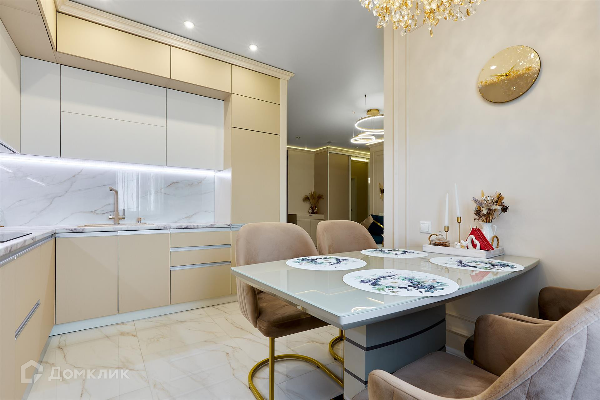 - в кухне-гостиной площадью 35 м2 - выложена в едином стиле турецкая плитка, теплые полы, на стенах сатиновая краска, по контуру стен - декорированные молдинги, раздельное точечное освещение с проходными выключателями. Одна из главных роскошей  - дагестанская люстра  выполненная из стекла. В кухне полностью встроенная техника - DORENJE, посудомоечная машина - BOSH, индукционная плита - ELECTRO LUX, духовой шкаф, микроволновая печь, смеситель фирмы - DR.GANS;
