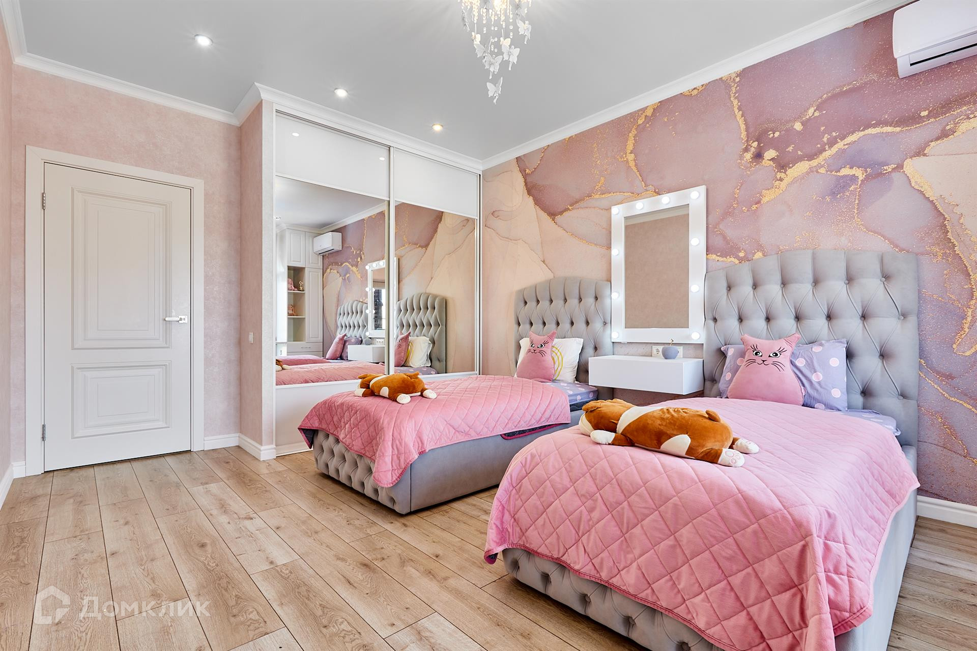 - в детской комнате ламинат 33 класса, вся мебель встроенная, на стенах выполнена фрезка, имеется парящее зеркало, теплые полы. В квартире имеются 3 сплит-системы.