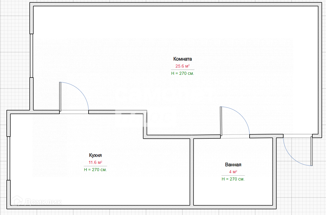 Площадь объекта 41,5м2. Высота потолка 3,2м. Кухня 11,6м2. Комната 25,6м2
