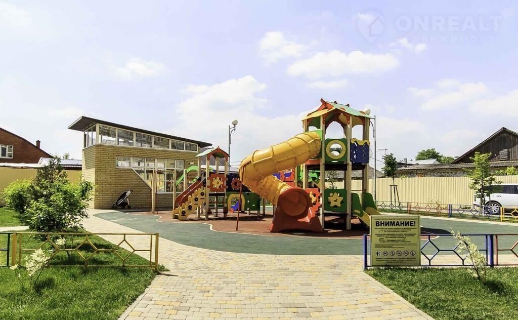 Дом с отличным местоположением и благоустроенной придомовой территорией. Современные и безопасные детские площадки.