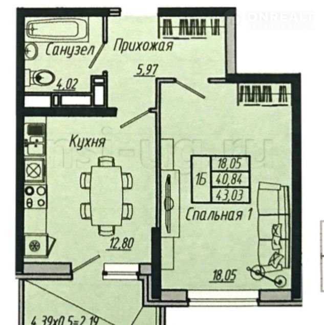 Общая площадь 43 м2