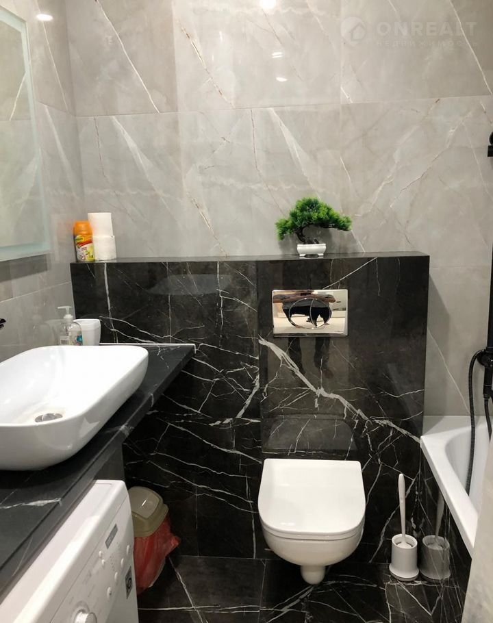 Новая сантехника и стиральная машина. Компактная ванна и удобный подвесной унитаз. Предусмотрено место для хранения необходимых вещей. Стильное сочетание темной и светлой плитки создает эффектный вид.