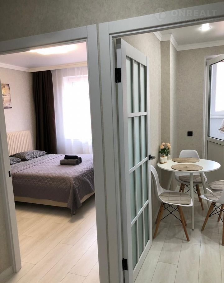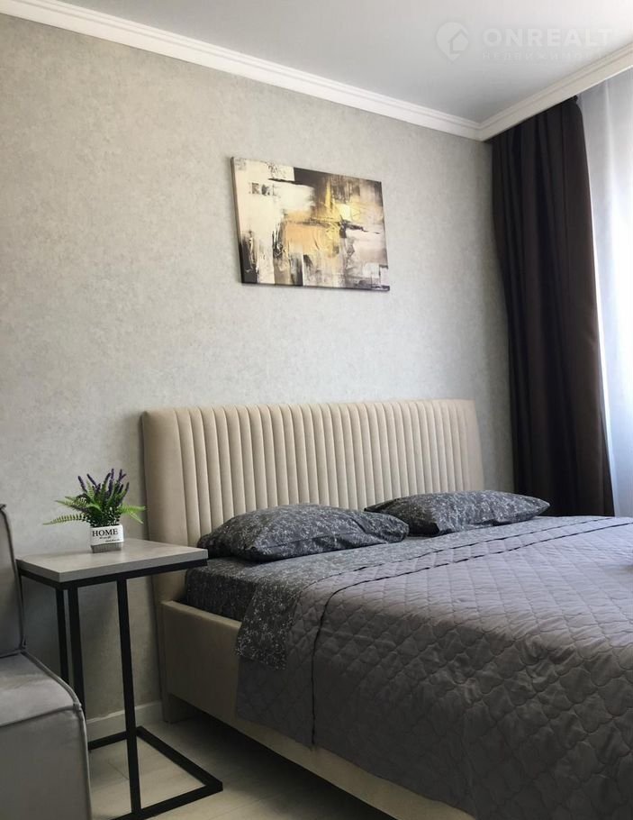 Комфортная двуcпaльная кpoвaть c мягким изгoловьeм. Стильная картина и элементы декора создают приятную атмосферу. Прикроватная тумбочка для необходимых вещей. Шторы на окне обеспечивают приватность и защиту от света. Современная кухня с новым гарнитуром в лаконичном стиле.