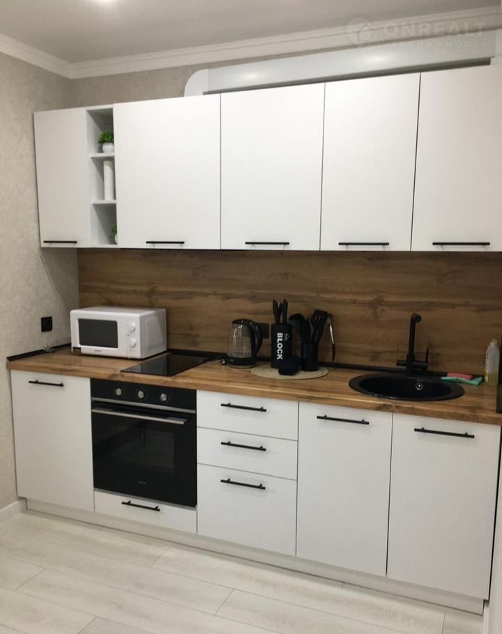 Встроенная духовка и варочная поверхность. Удобная рабочая зона с качественной столешницей. Достаточно места для хранения посуды и кухонных принадлежностей. Светлый пол и стены создают ощущение простора. Современный санузел, отделанный качественной плиткой.