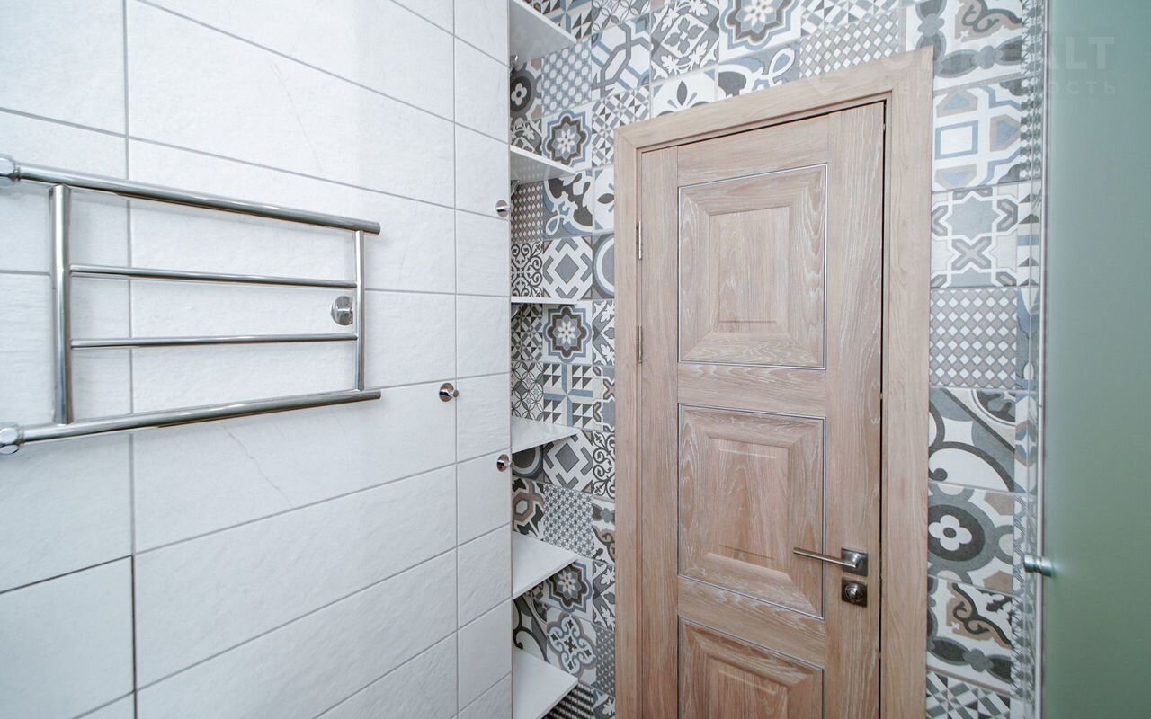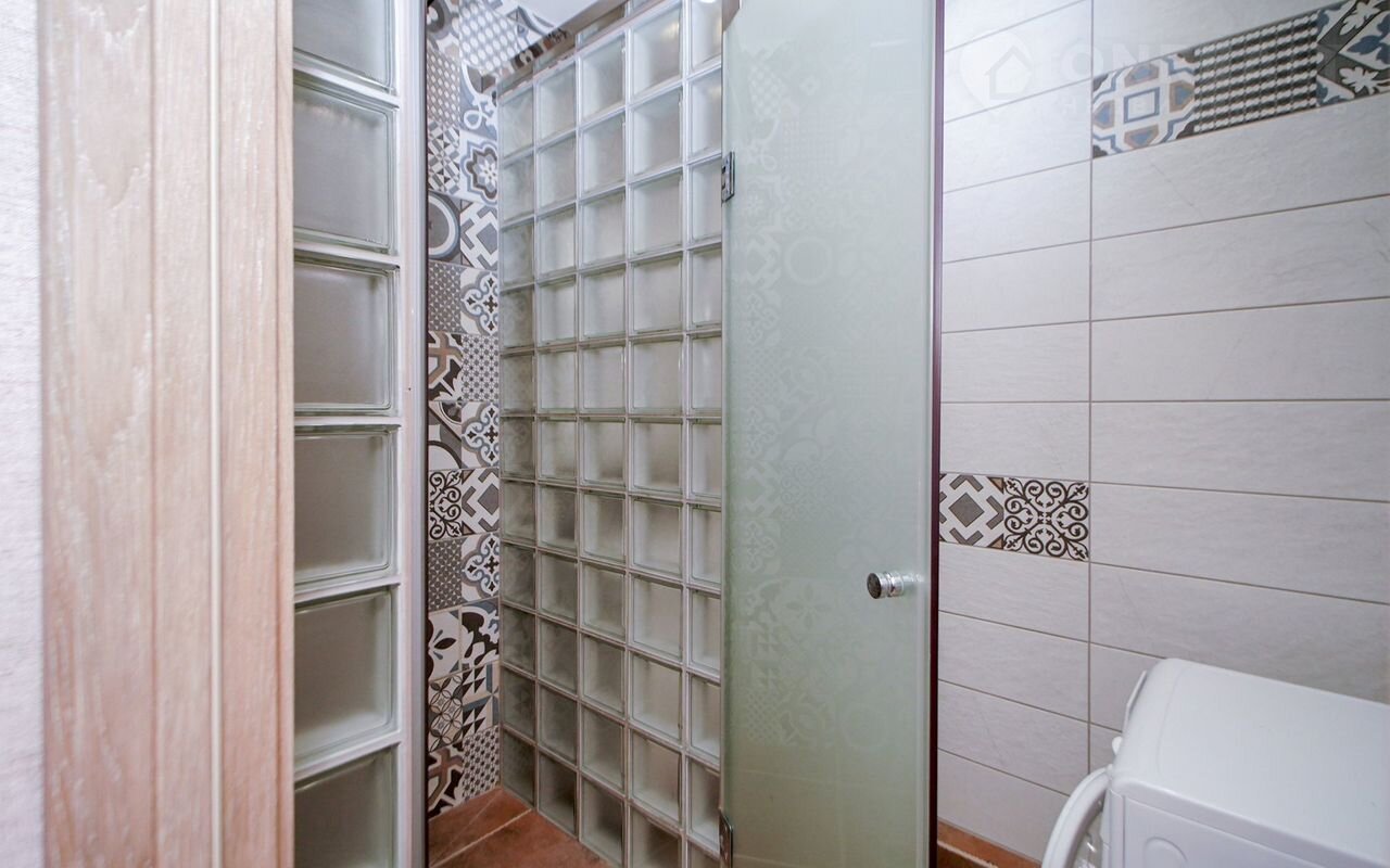 Ванная эргономичной формы вместила себя не только сантехнику, но стиральную машины.