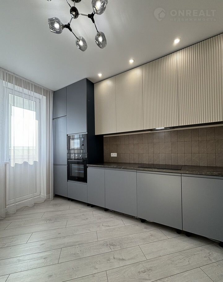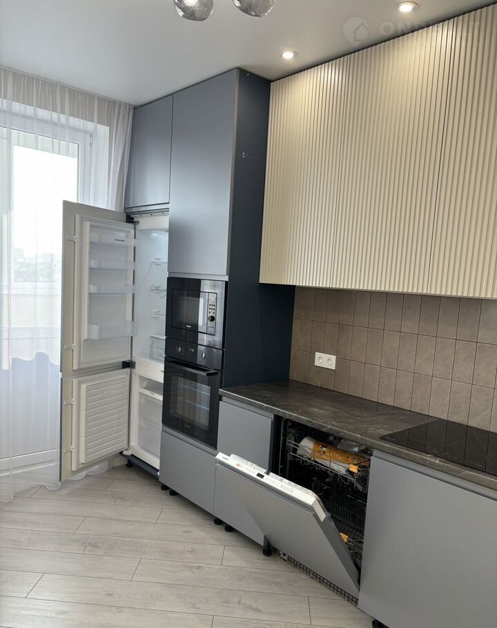 На кухне установили стильный кухонный гарнитур со встроенной бытовой техникой: варочная панель, вытяжка, духовой шкаф, посудомоечная машина, холодильник.