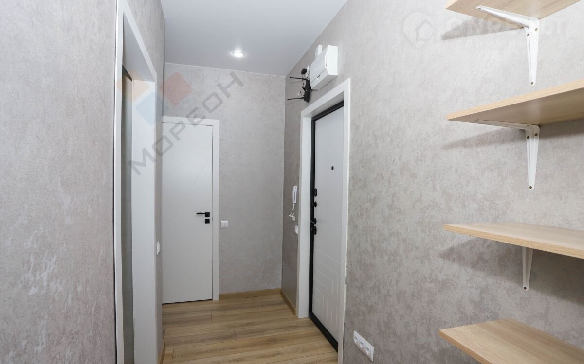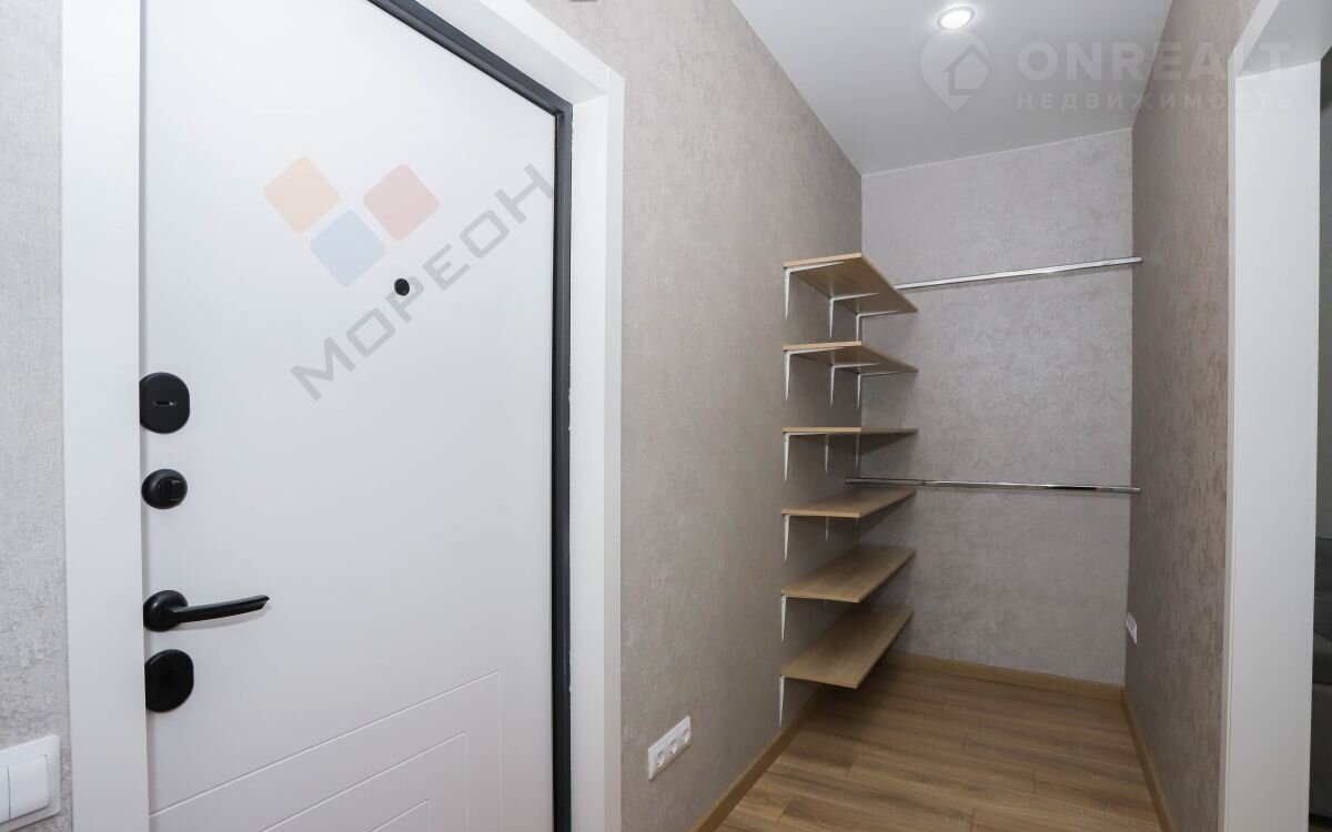 В квартире также есть просторная гардеробная, которую можно закрыть дверью-купе для дополнительного уюта.