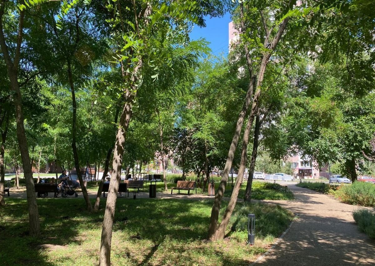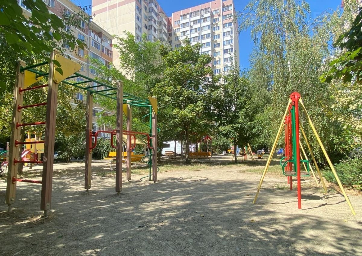 Тенистый, зеленый двор с детской площадкой и детским садом!