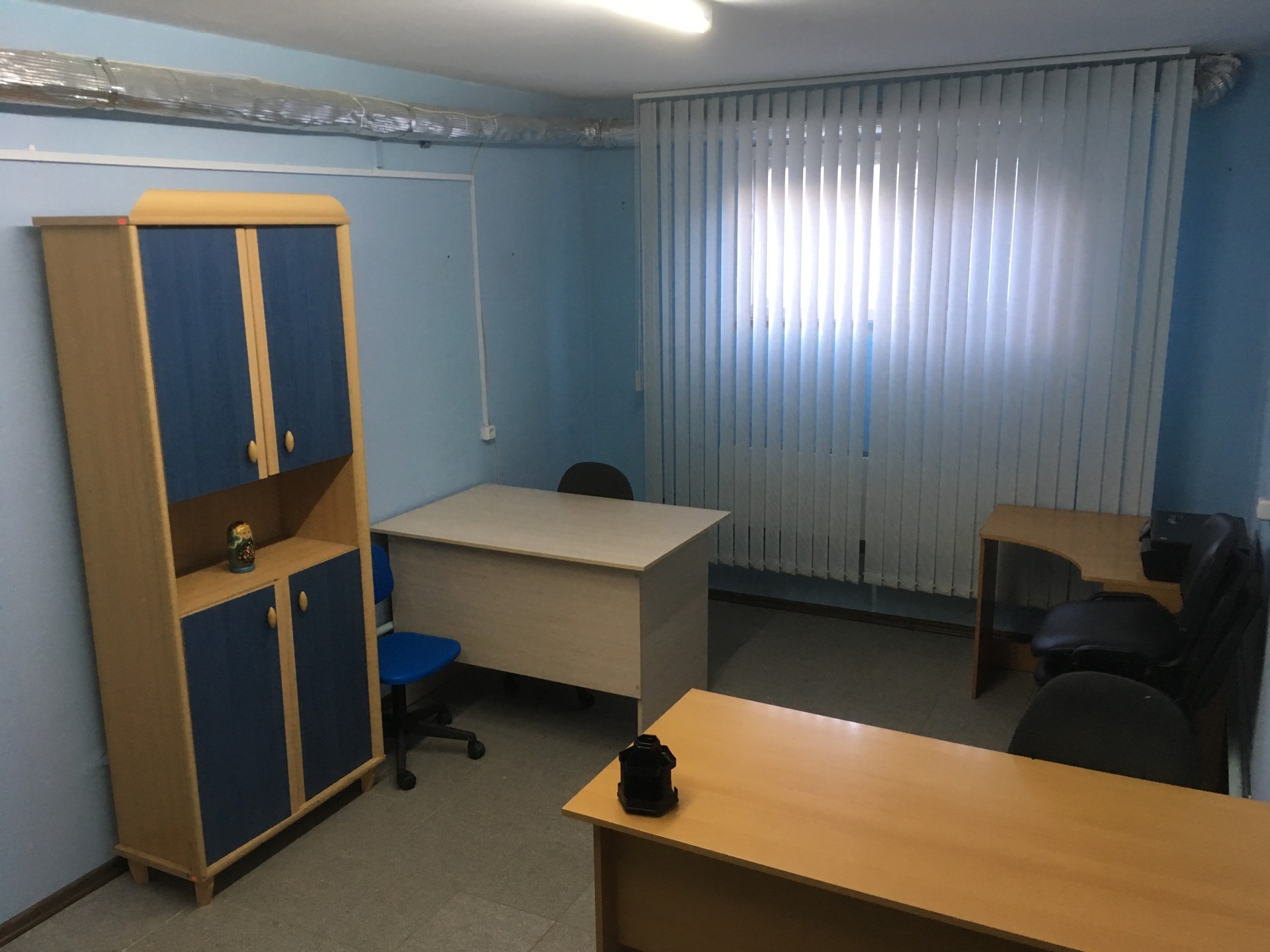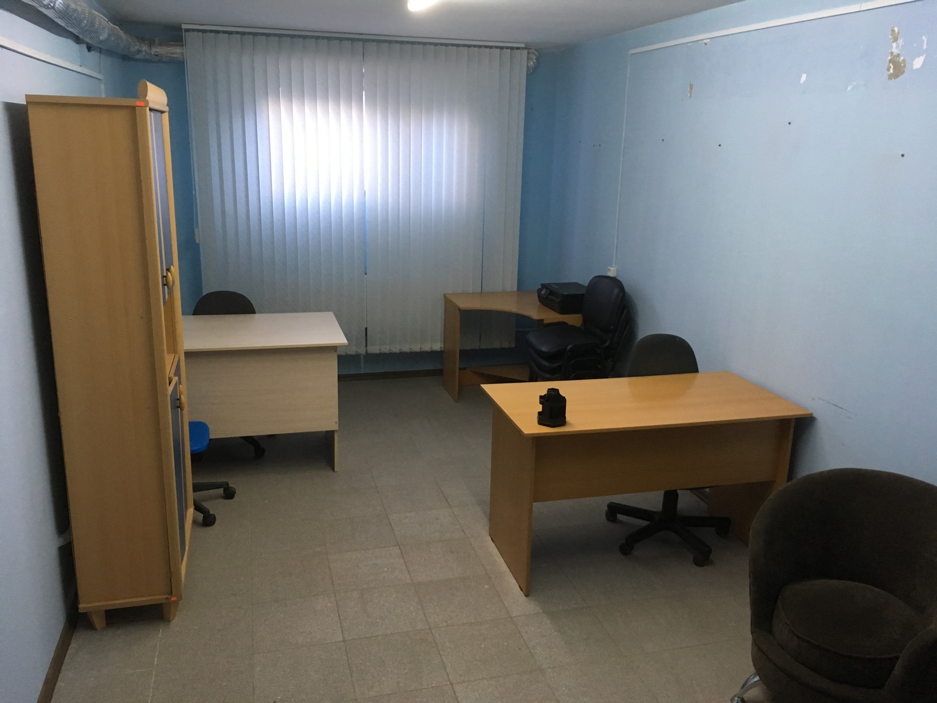 Мебель входит в стоимость: 3 стола, 3 стула, шкаф для документов, диван.