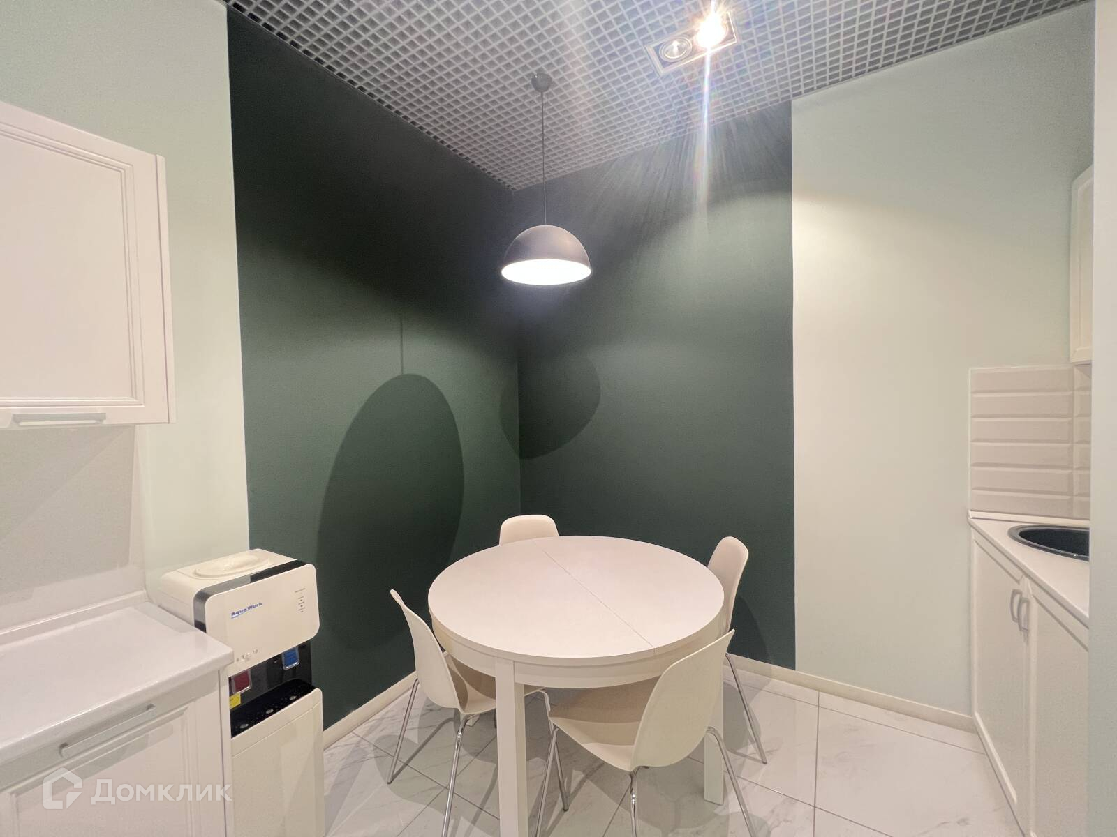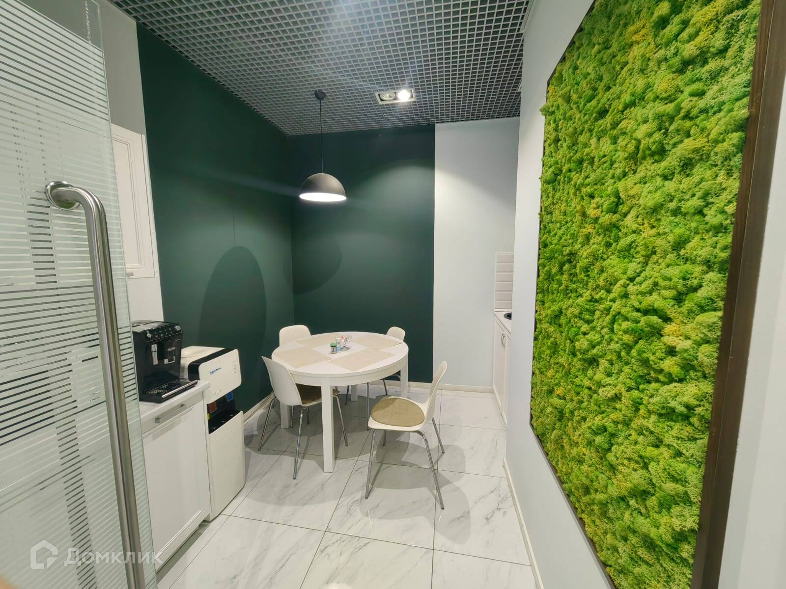 При входе в офис дизайнерская зона Reseption. Оборудованная кухня с кухонным гарнитуром и обеденным столом, холодильник.
