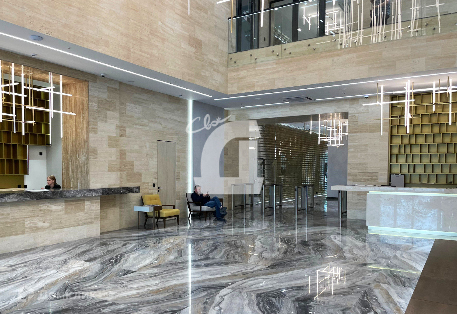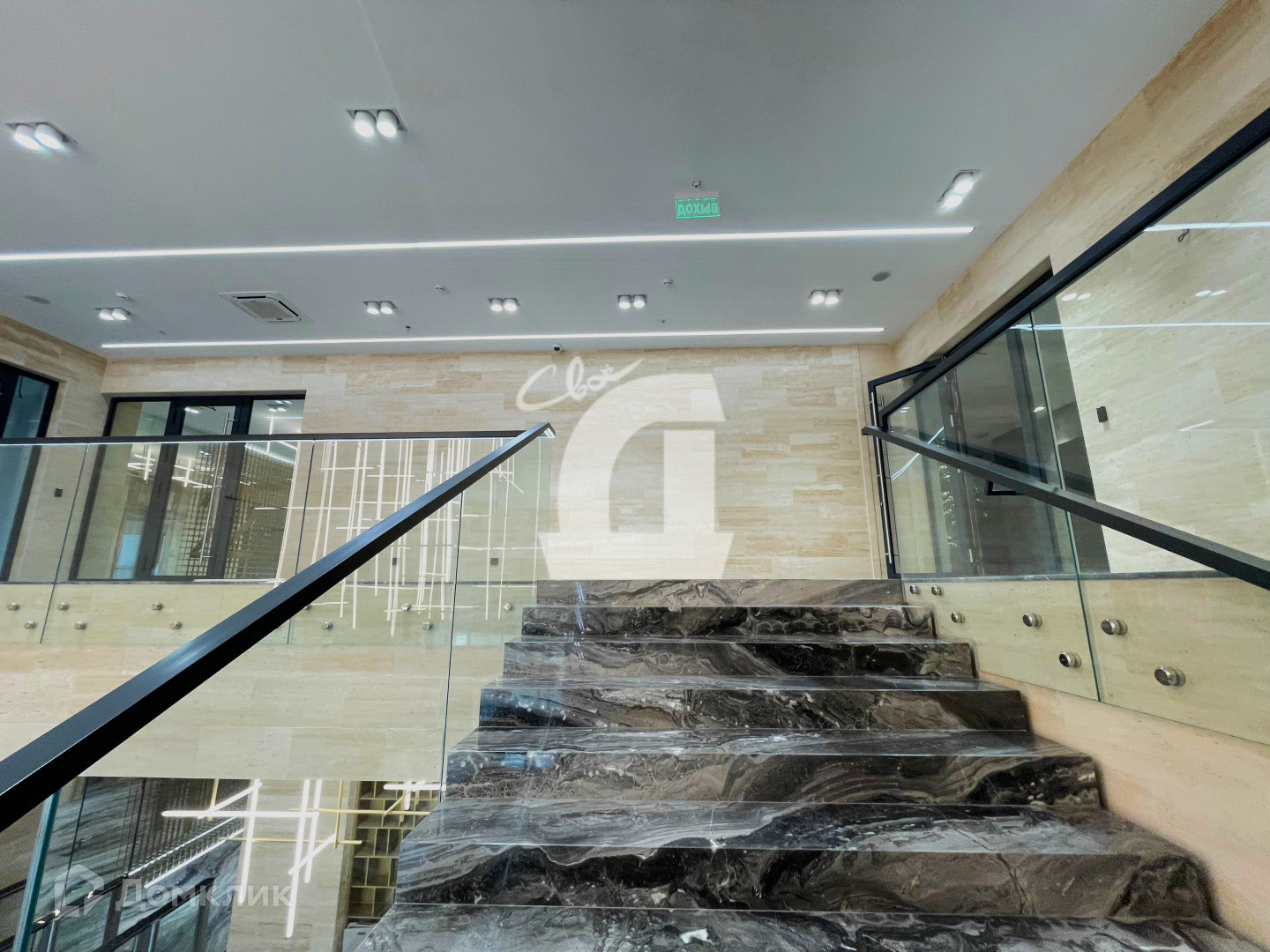 -При выходе из лифта Вас встречает просторный холл-место для ресепшен, за которым находятся витражи на атриум бизнес центра.